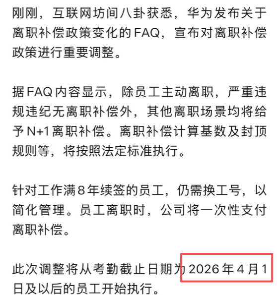 华为的离职补偿新规更新,取消主动离职的N+1补偿了。