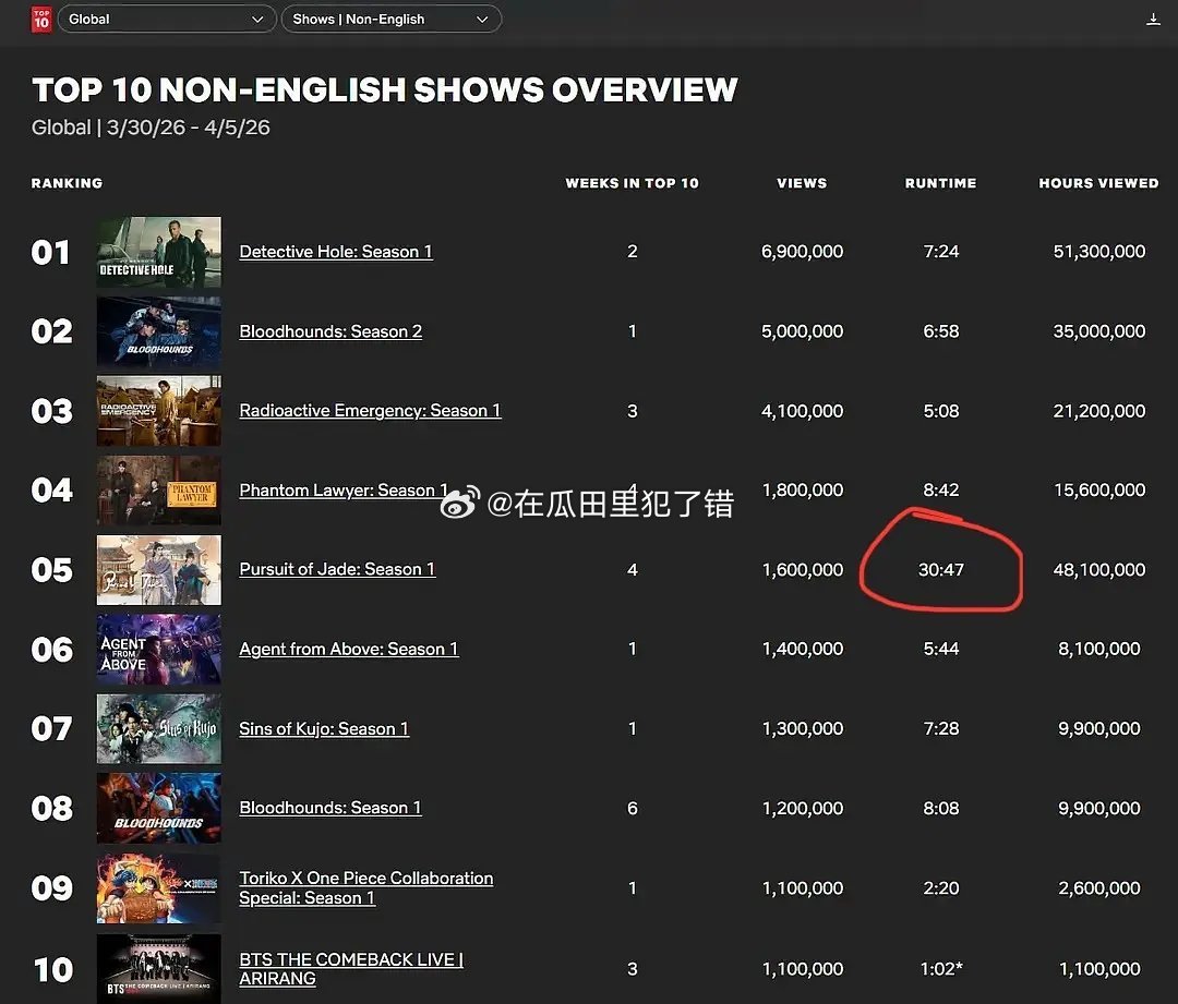 张凌赫田曦薇主演的《逐玉》连续四周进入网飞周榜,首部以完整片长进入网飞非英周榜的大陆剧根据网飞官方报告,四周累计1.778亿view hours,700万completed views,逐玉完整片长30小时47分