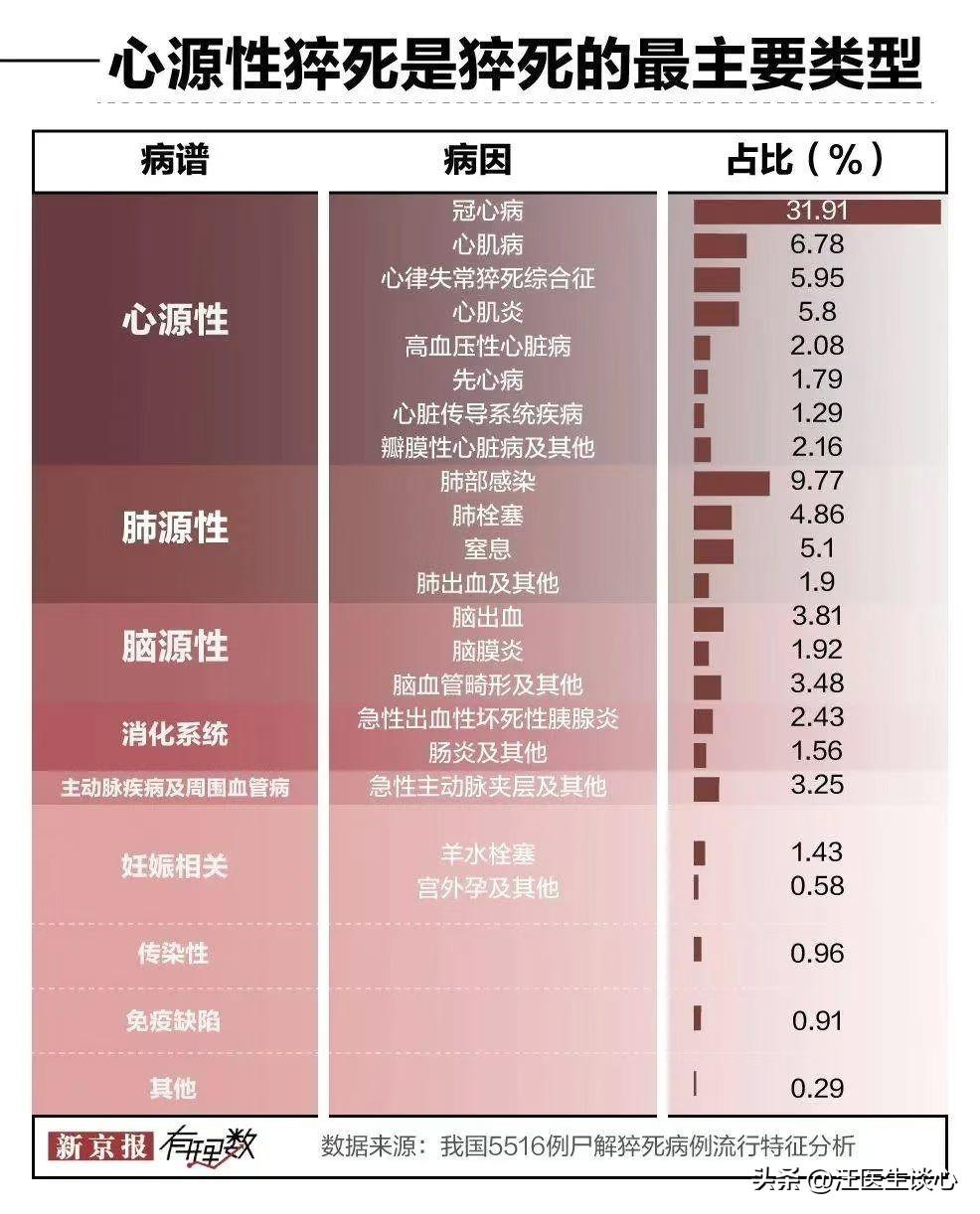 🚨 触目惊心!猝死真相大数据:心脏竟是头号杀手!冠心病是引起心源性猝死最主要原因。今天看着一组震慑人心的数据。这张图总结了我国5516例猝死病例流行特征,清晰揭示了不同类型猝死的构成比例。 🚨核心真相!心源性猝死占绝对主导。也就是说,在所有猝死的类型当中,因为心脏疾病导致的占比最高,远远超过肺源性,脑源性类型。 而在心源性猝死的原因里面,冠心病又是占绝对主导,其次是心肌病,再其次是肺栓塞。 心血管系统疾病,尤其是冠心病,是猝死风险防控的重中之重。同时,心肌病、肺栓塞以及脑血管疾病等也属于高风险的猝死原因。 ⚠️有哪些防控建议? 1.首先要明确哪些人群是高风险人群。40岁以上的男性、绝经以后的女性,有高血压、高血脂、糖尿病、肥胖的人群。这些都是高风险人群。 2.如果有冠心病家族史,比如说兄弟姐妹、父母亲都有冠心病,甚至有过心肌梗死病史的,也属于高风险人群。 3.有长期吸烟、饮酒、熬夜、工作压力特别高的人群,或者是既往有过心肌梗死、心绞痛病史的患者,都是属于高风险人群。 ⚠️如何筛查? 1.基础检查项目包括血压、空腹血糖、血脂、糖化血红蛋白。肝功能、肾功能。 2.心脏超声和心电图,或者是动态心电图。心脏超声可以反映心脏结构是否正常。心电图或者动态心电图可以反映心脏电活动是否正常。 3.对于高危人群,可以做冠状动脉CTA检查做筛查。如果以前有过心梗或者是心绞痛病史的,推荐做冠脉造影。心源性死亡 心肌猝死