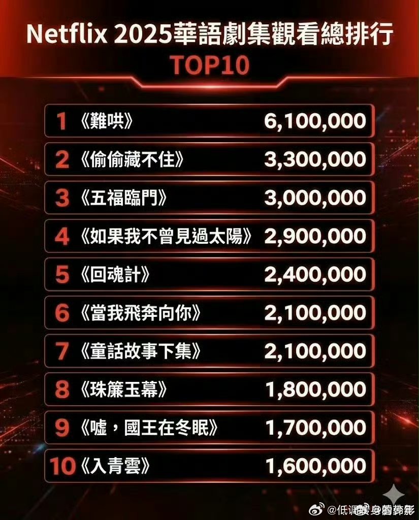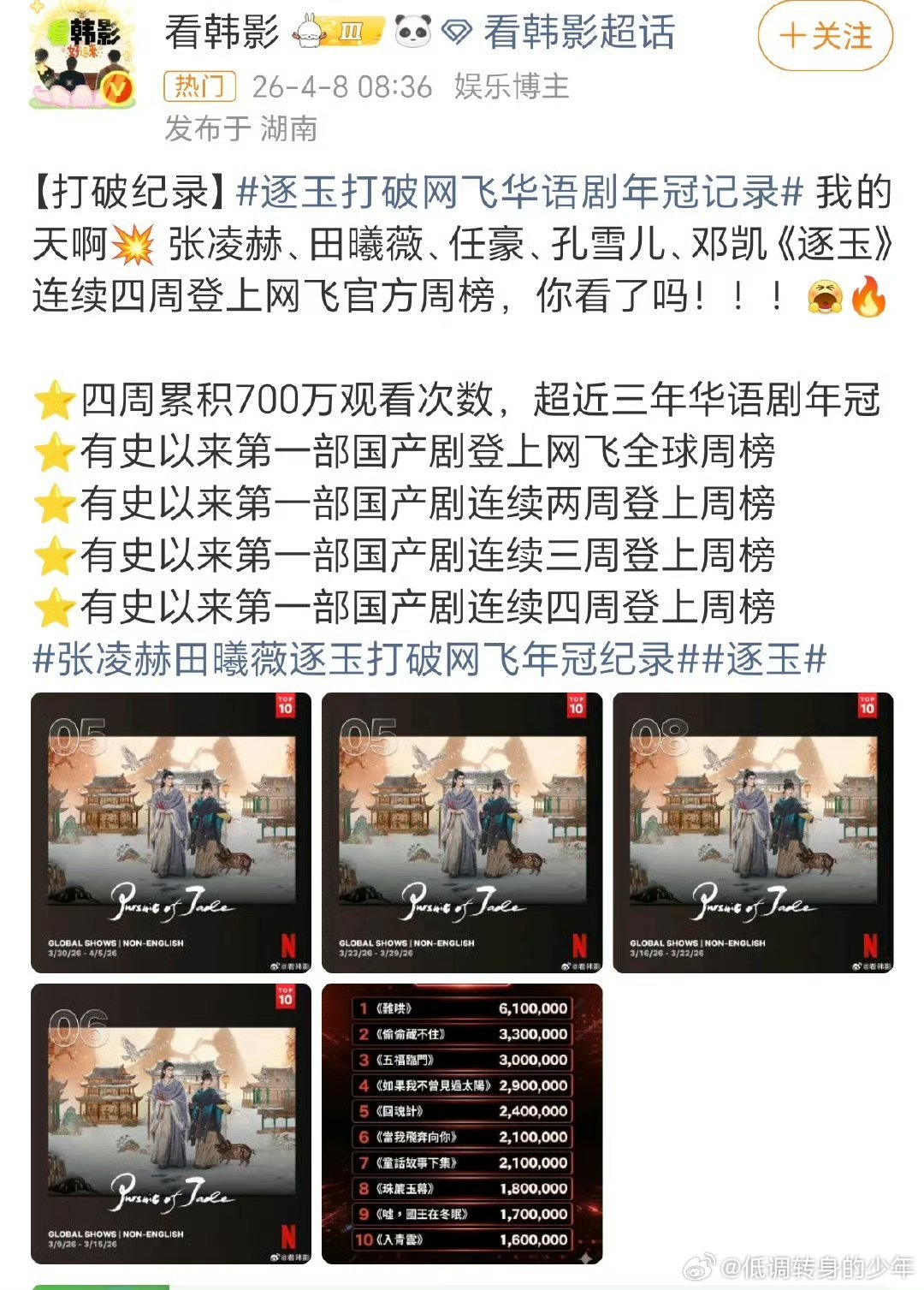 逐玉打破网飞华语剧年冠记录逐玉在网飞上线仅一个月就打破了之前的国产剧观看记录!台网都是无短板张凌赫谢征厉害👍🏻!⭐四周累积700万观看次数,超近三年华语剧年冠⭐有史以来第一部国产剧登上网飞全球周榜⭐有史以来第一部国产剧连续两周登上周榜⭐有史以来第一部国产剧连续三周登上周榜⭐有史以来第一部国产剧连续四周登上周榜逐玉打破网飞华语剧年冠记录