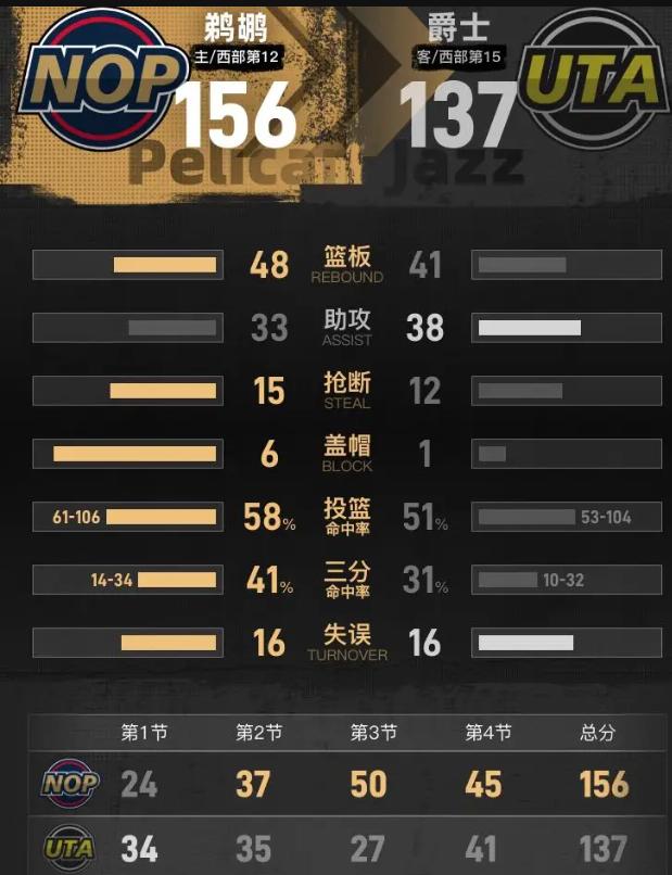156比137,鹈鹕把爵士揍成了筛子。您先别急着夸费尔斯那40分,这孩子确实猛,7号秀砍生涯新高,正负值+30,可咱得说句公道话——这数据的水分,比鹈鹕的 swamp 还潮。 Jazz 这帮年轻人,压根不是来打球的,是来刷 KPI 的。您瞧瞧这防守:费尔斯突破,身前半米没人;普尔第三节连扔 4 个三分,爵士球员手都懒得伸,活像五个交通指挥员,光伸手不挪步。 这叫防守?这叫目送。十连败的队,心气早散了,散了您知道吗?就跟那泄了气的皮球,拍都拍不起来。 鹈鹕这边,普尔第三节 22 分,单节 50 分,可您细想,这哪是鹈鹕进攻多炸裂,这是对手主动递梯子。钱德勒 31 分、姆本 26 分,数据刷得漂亮, 有用吗? Jazz 上半场还领先 8 分,下半场直接躺平,防守轮转比我周末起床还慢。 重建不是这么个重建法,您教年轻人刷分,不教他们怎么咬紧牙关卡位,这培养的是球员还是数据乞丐? 说白了,费尔斯这 40 分,一半是实力,一半是爵士的"人情世故"。 真要感谢对方这防守强度,让新秀打出了全明星数据。可鹈鹕球迷先别高潮,击败一支不想赢的队伍,就像在健身房欺负退休大爷,胜之不武。 重建需要脊梁骨,不是打卡机。 爵士这 10 连败,输的不是天赋,是态度。 当防守变成可选配件,这支球队的根就烂了。费尔斯们该记住这场球——不是记住 40 分的甜蜜,是记住对手这种"放弃防守"的恶臭。将来您成名了,千万别学这一出。