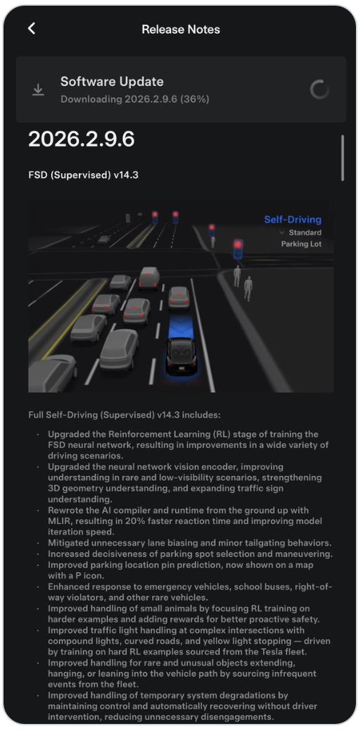 特斯拉FSD v14.3有哪些新功能 特斯拉已正式开始向早期体验计划 (EAP) 成员推送FSD v14.3版本,其中包含许多新的改进。马斯克称v14.3可能是“拼图的最后一块”,所以用户对此次发布寄予厚望。 特斯拉在MLIR平台上从零开始重写了AI编译器和运行时,可将响应速度提升20%; 此次更新还新增了地图上的停车位标记,增强了对紧急车辆、校车、违反路权者和其他罕见车辆的响应; 提高了停车位选择和操控的果断性; 减少了不必要的车道偏移; 改进了在复杂路口(包括复合信号灯、弯道和黄灯停车)的交通信号灯处理; 改进了对延伸、悬挂或倾斜到车辆路径上的罕见和不寻常物体的处理; 通过保持控制并在无需驾驶员干预的情况下自动恢复,改进了对临时系统故障的处理,减少了不必要的脱离。【来自懂车帝车友圈】