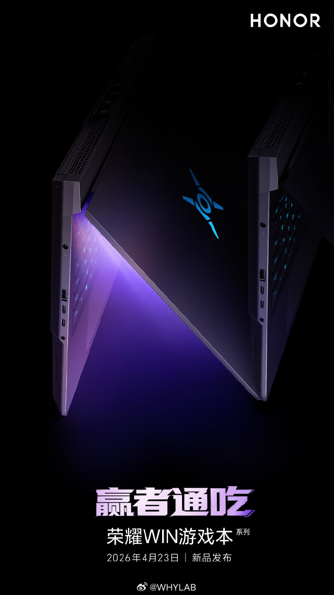 荣耀 WIN 游戏本的电竞味还是挺足的,自带 RGB 炫彩灯效,猎人发光 LOGO。