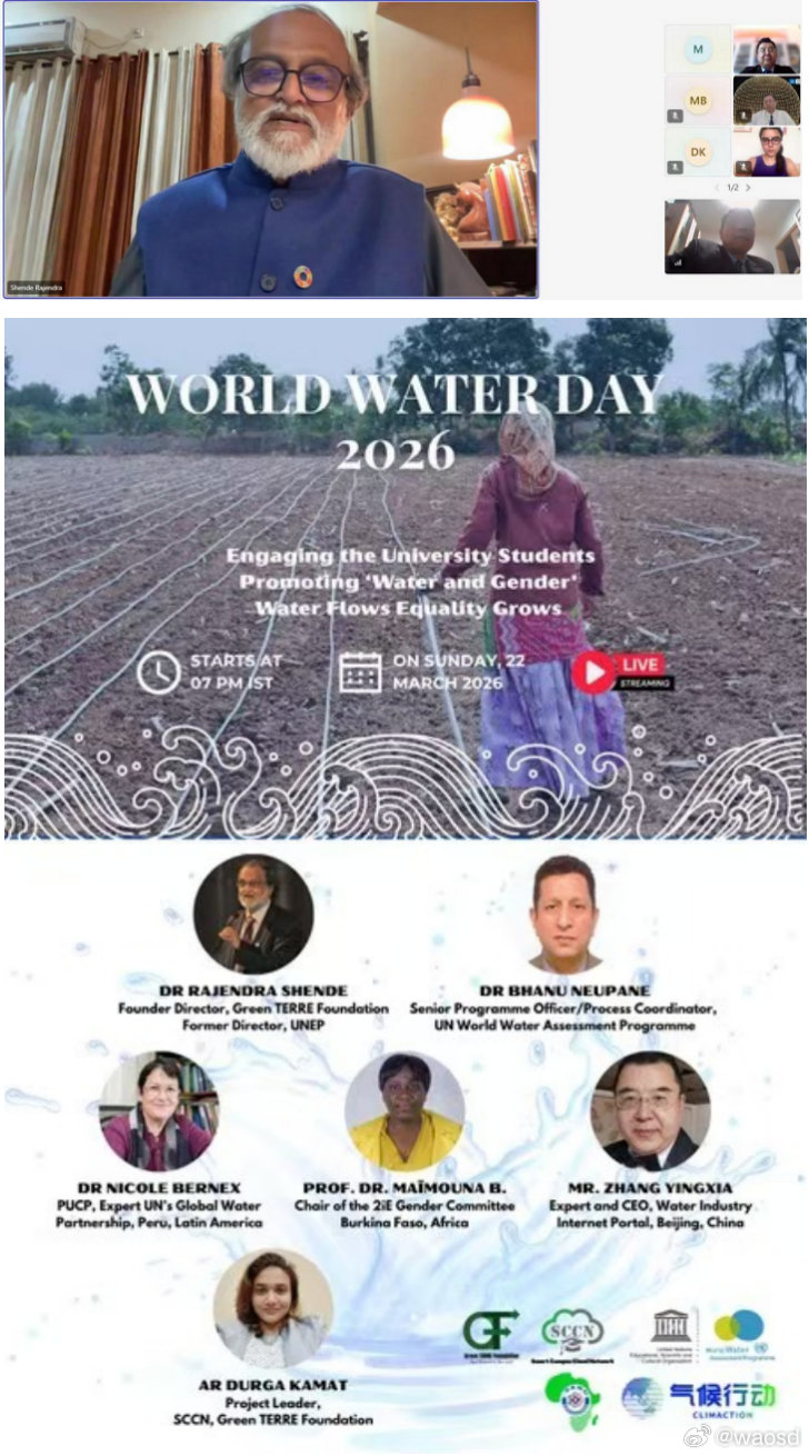 2026 年世界水日之际,一场以 “水润万物,公平共生” 为主题的全球线上论坛成功举办。论坛由印度绿色地球基金会与联合国教科文组织联合主办,世界可持续发展科学院高度关注并支持该议题的全球传播与落地实践。可持续发展世界水日女性性别平等全球水治理水公平联合国教科文组织
