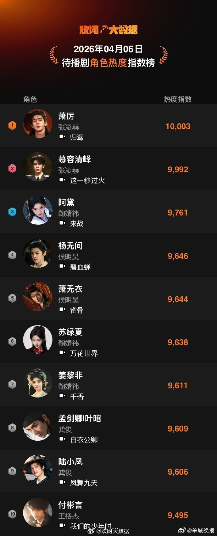 【#张凌赫萧厉待播剧热度第一#】 #张凌赫待播剧双角色霸榜# 据4月6日欢网大数据日榜显示,待播剧角色热度指数TOP10榜单正式出炉,演员凭借两部待播剧中的角色强势霸榜,分别斩获榜单第一名和第二名,展现出超高人气与市场期待值。