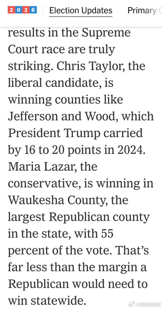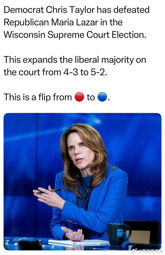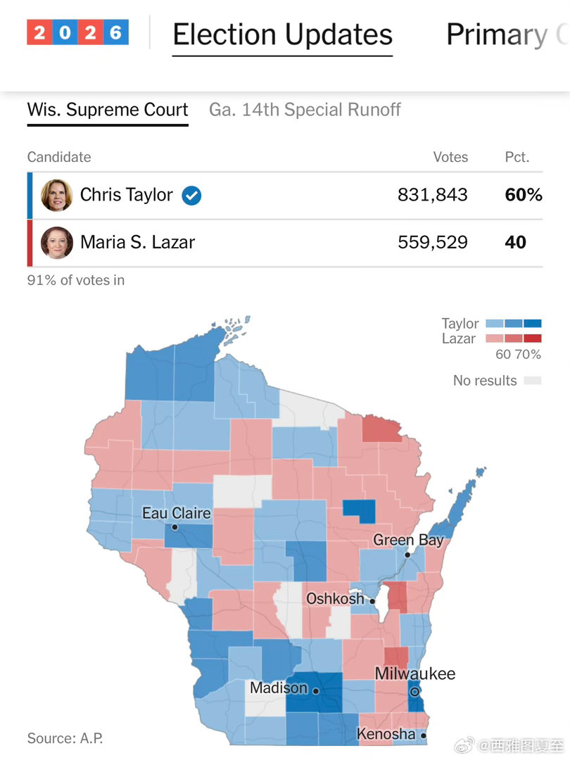 威斯康辛州最高法法官选举,自由派候选人以20个百分点的优势击败保守派,将这一席翻蓝