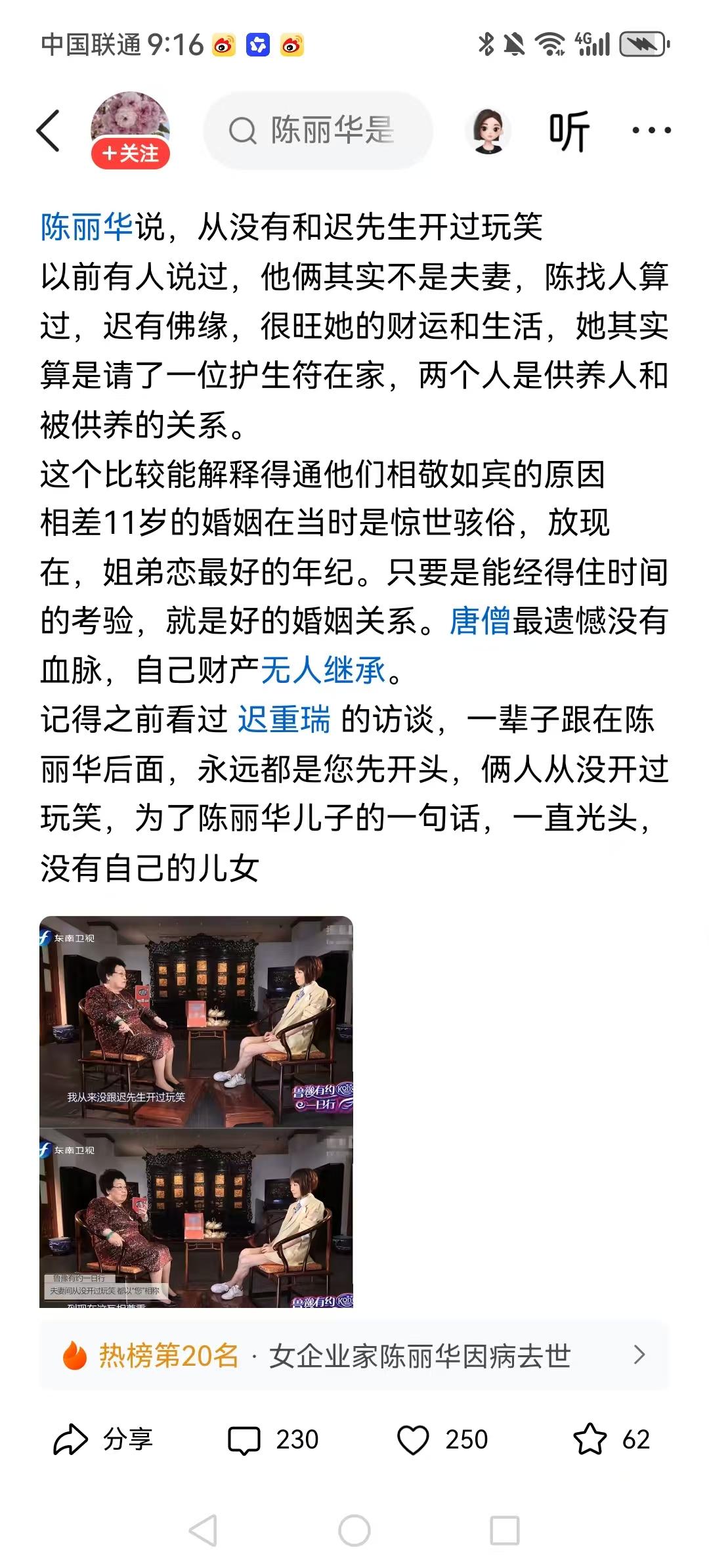 陈丽华说,从没有和迟先生开过玩笑。这种婚姻,女的自己也会觉得没意思吧,等于把职员领回了家里。 我不想恶意推测,但是从之前一些新闻透露出他们夫妻之间的生活片段,我真觉得,她找迟,跟古时候一些人去庙里说求个佛系供在家里,真没什么区别。 唐僧总算耗出头了,现在开始可以变花样玩,弥补这几十年。 相敬如宾的夫妻生活其实并不可取。赚钱的时候风风火火,独处的时候如同水火,婚姻生活就失去了应有的乐趣。 一个有钱男企业家,身家哪怕只有陈丽华百分之一,娶个年轻20-30岁的女人,好像大家都觉得很正常。