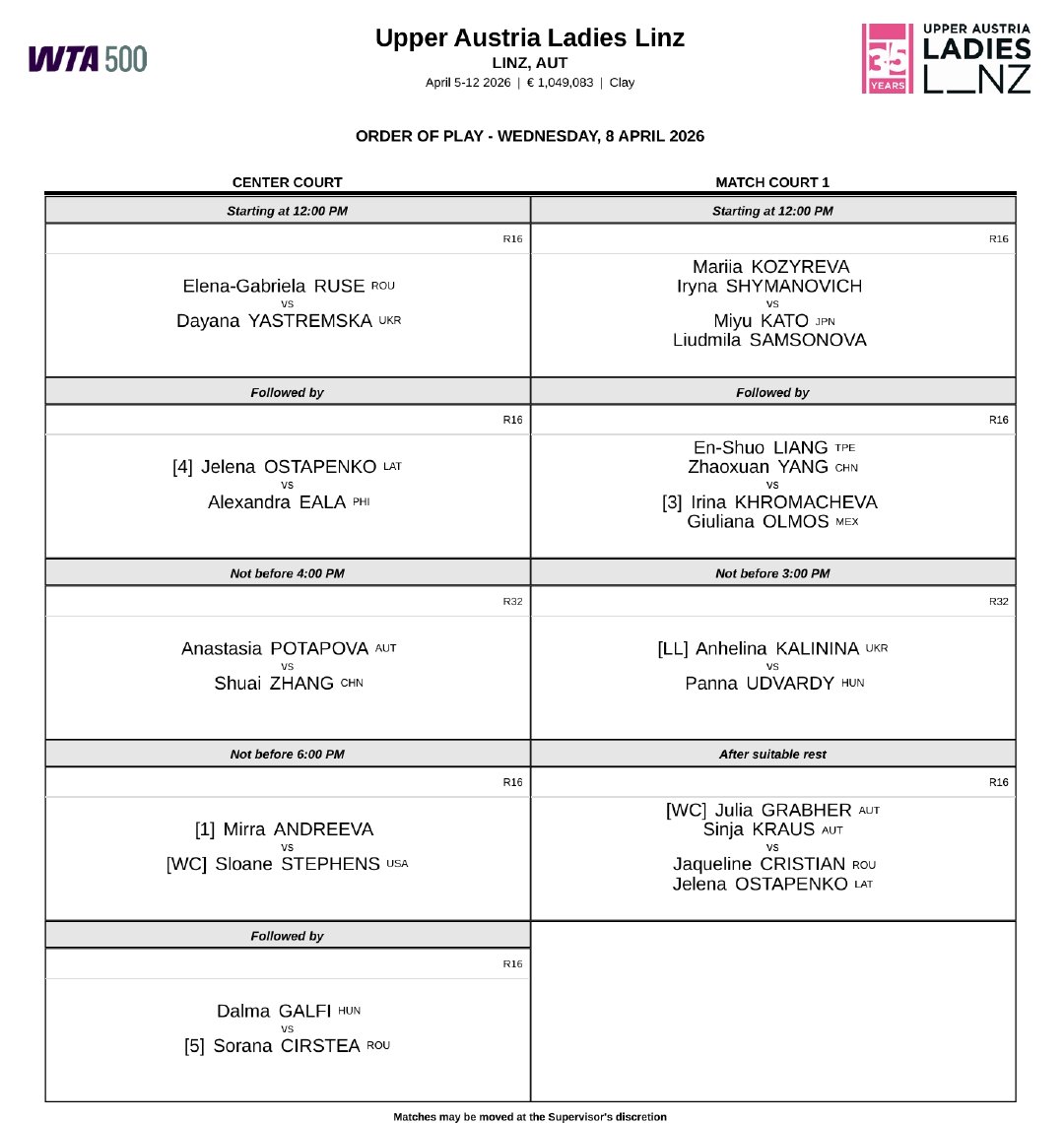 米拉·安德列娃迎来红土首秀,张帅对阵波塔波娃,奥斯塔彭科再战伊埃拉。以下安排均为北京时间👇