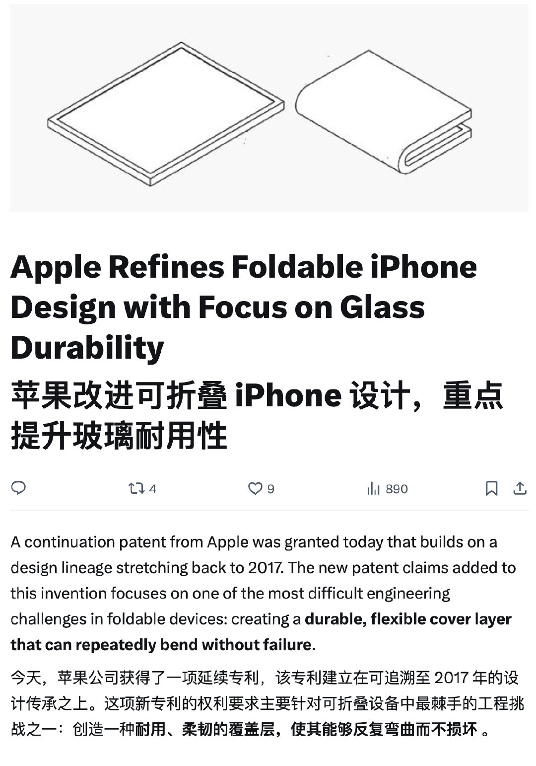 昨天还在热搜iPhone折叠机遭遇工程挫折今天就有新的苹果折叠屏iphone新专利获批苹果改进可折叠 iPhone 设计,重点提升玻璃耐用性。by Patently Apple
