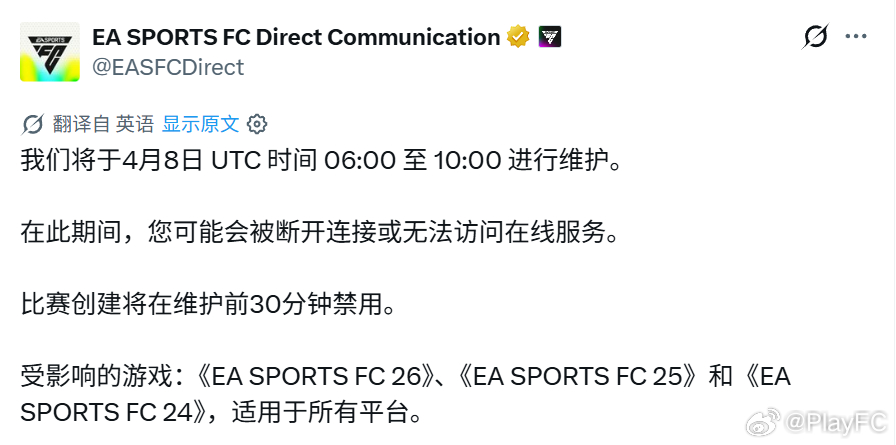 EA SPORTS发布公告:4月8日14:00将对服务器进行维护,时长4小时。期间所有在线服务均不可用。