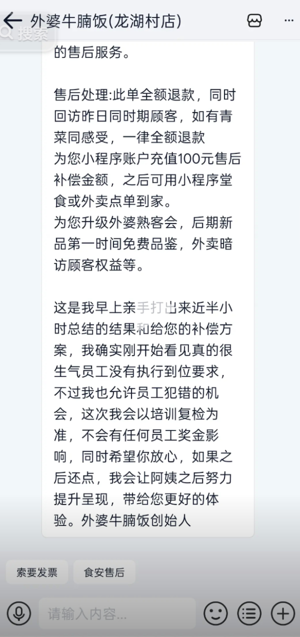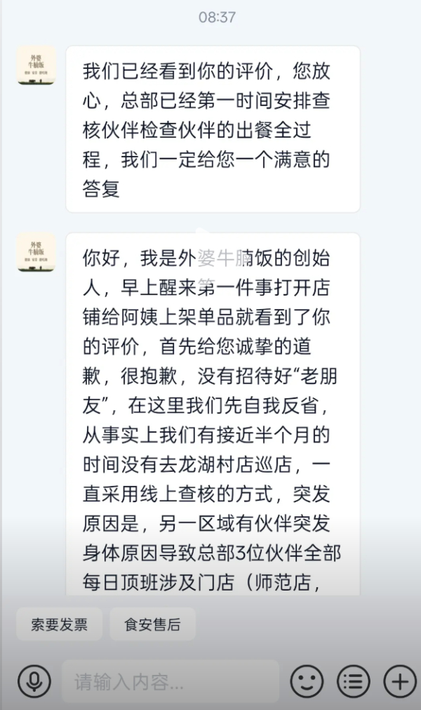 事情的转折就在她发布的后几张聊天截图。截图显示,商家看到她的评论后,很快通过平台私信回复,先表示“总部已经第一时间安排查核”,随后“外婆牛腩饭创始人”通过官方账号详细告知这位顾客调查的情况,确认确实少送了一根火腿肠,解释了青菜可能出现酸味的原因,以及鸡腿口味不如以前的原因,并表示已要求门店整改反馈,给顾客此单全额退款,还给该顾客在店铺小程序的账户充值。