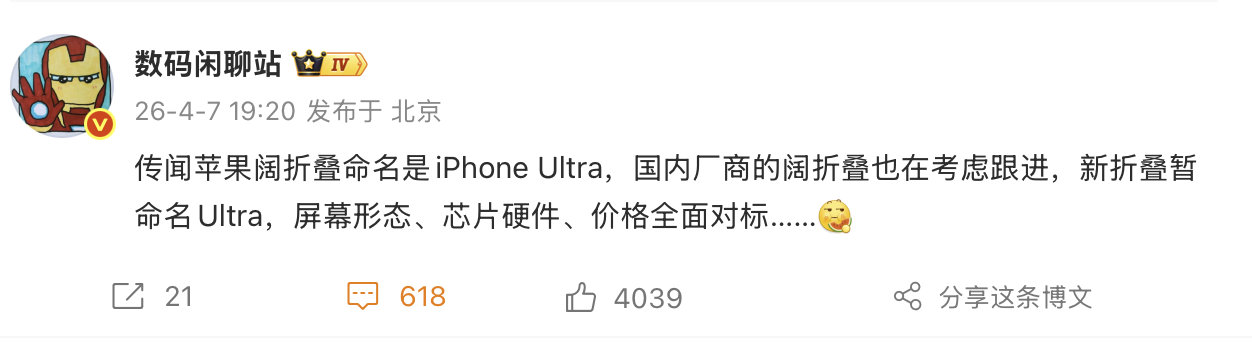 如果 iPhone 折叠屏真的命名 Ultra 的话……(苹果目前有几个 Ultra?)曝苹果阔折叠命名iPhoneUltra首先,Apple Watch Ultra,牺牲体积(增大)很外形,各方面拉到顶。其次,Apple Silicon 的 Ultra,也是各方面拉到顶,当然强行从 UltraFusion(胶水) 技术的角度来说,体积也是不考虑的。如果说两片芯片 Fusion 成一片 Ultra 这个角度的话,命名 Ultra 无可厚非,如果说从体积增大的角度的话(展开的时候确实很大),好像 Ultra 的命名也没有毛病。但是,总觉得 Ultra 应该和性能或者说(全能)有强烈关系。难道,iPad+iPhone 的“全能”体验,就是 Apple 眼中“全能”的 Ultra iPhone?