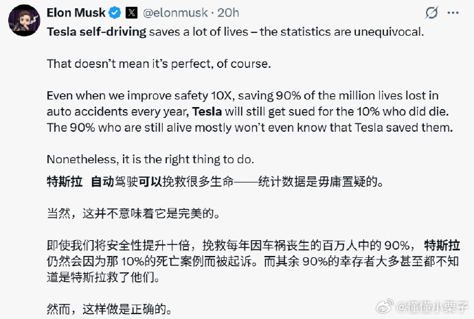 马斯克近期为 FSD 辩护,折射出自动驾驶行业面临的舆论困境。相较于人类驾驶的风险被普遍接受,智能驾驶却被要求绝对安全。FSD 在真实场景中持续降低事故率,用数据证明安全价值,却仍面临严苛指责与监管压力。技术进步需要时间与空间,过度苛求只会延缓安全普及。客观看待、理性评判,才是对技术与生命真正负责。马斯克为 FSD 鸣不平新能源汽车特斯拉
