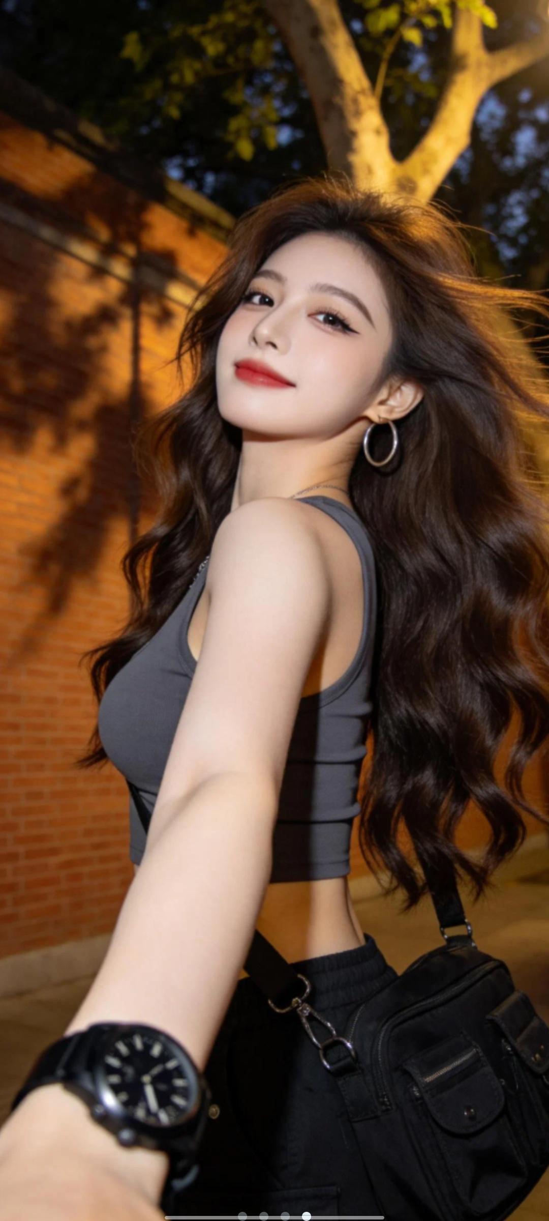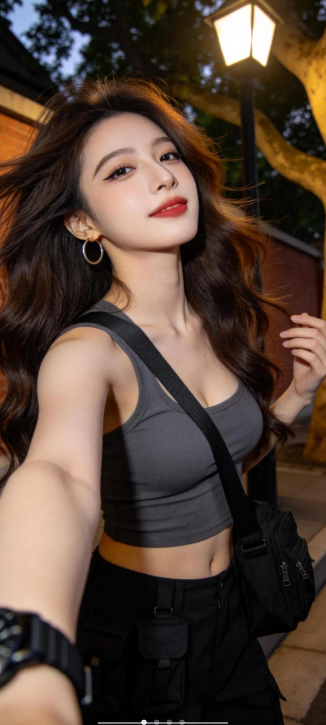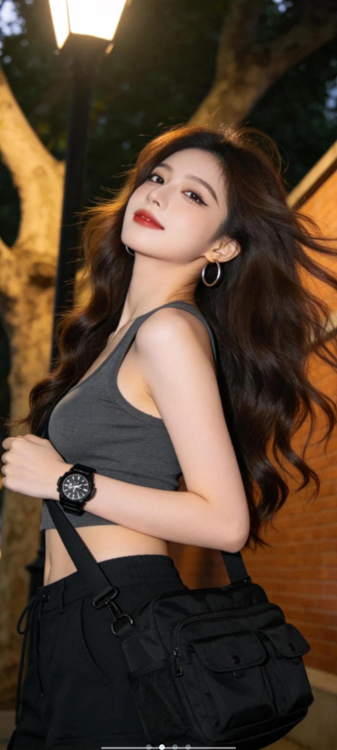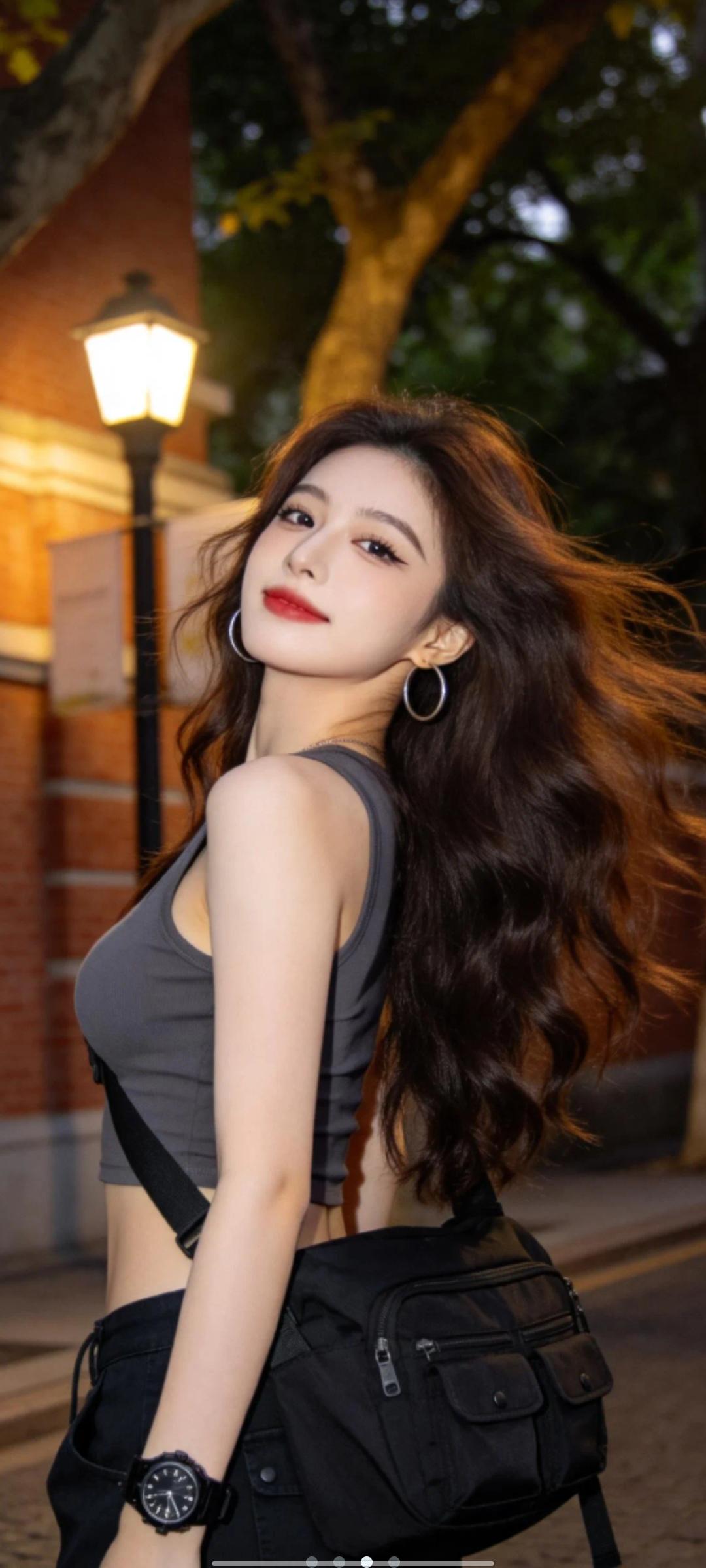 一位长发及腰、模样似洋娃娃般可爱的女生,采用超广角,体现动态美学,害羞,感受风,与镜头互动,人像摄影,日常快照风格,非精心构图或打光,小上围,妖冶少女,冷白皮,瓜子脸尖下巴,皮肤白皙,底妆通透,极其平凡无奇的快照,没有明确主体和构图感,长头发的闺蜜,穿着宽松衣服,中二风格,自拍视角,背景是夜晚下的路灯下。采用抖音辣妹日记的风格,以高清8K的画质,通过中近景略微仰拍的视角,呈现出一位年轻的东亚辣妹。她的神态慵懒,深棕的大波浪卷发有着高颅顶,发丝凌乱又飘逸。浓颜系的妆容十分吸睛,上扬的眼线和红唇增添了她的魅力。她身着深灰色露腰背心,搭配黑色工装裤,斜挎着黑色多口袋的腋下包,配饰有圆圈耳环和黑色大表盘手表。背景是城市文艺街头的红砖墙与大树,暖调的光影下,斑驳树影错落,浅景深的虚化效果突出了她动态抓拍下微侧后仰、慵懒拽飒的身姿,整体色调为暖棕灰黑调。什么样的穿搭可以成为气质女神?