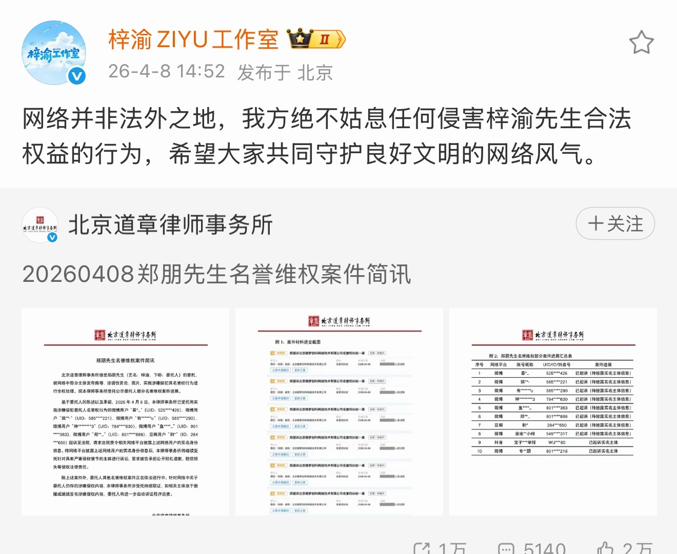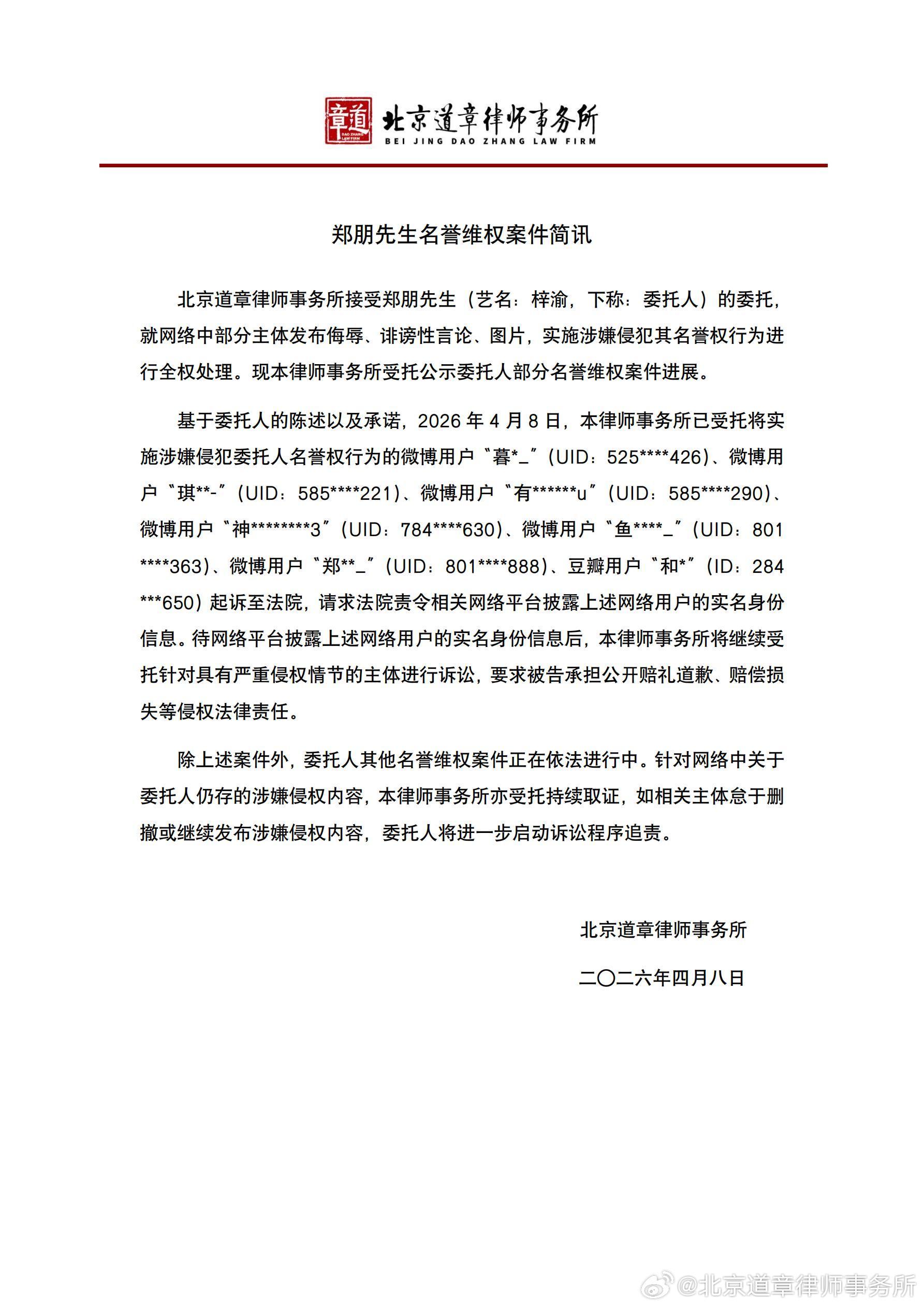 梓渝工作室转发郑朋(艺人梓渝)名誉维权案件简讯!清朗网络,守护梓渝,相信法律,静待公正。梓渝