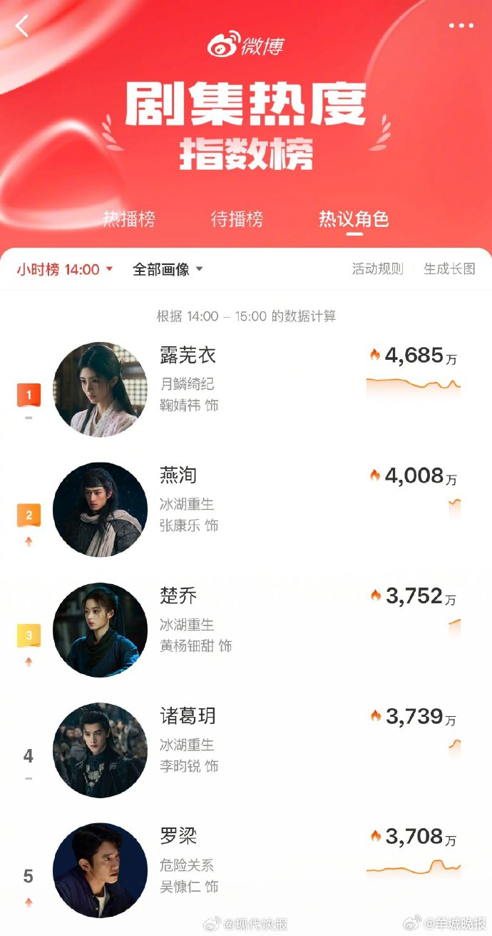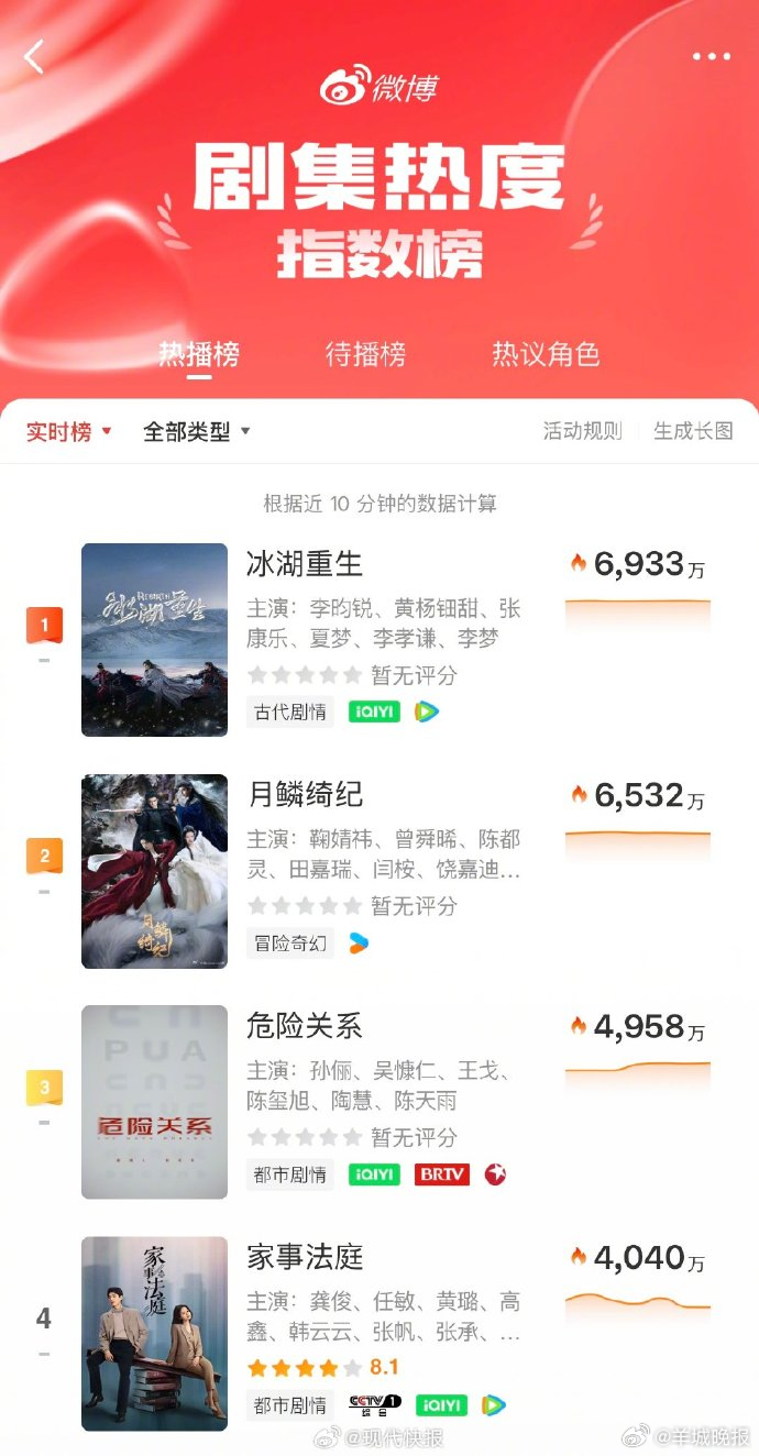 #冰湖重生开播4小时热度登顶# 4月8日,由、、 领衔主演的新剧《冰湖重生》开播。开播4小时,该剧热度已登顶达6883万。饰演的燕洵热度飙高达4008万。你追剧了吗?(现代快报)更多消息:#王濛 组内唯一大vocal##刘思维当爸爸了##金子涵 再逼我就把所有的都说出来##孙怡 幼态脸高妹##TF四代高会粉丝数关闭##宇文玥捞上来了#(编辑:杨雨桐;审签:周乐瑞)