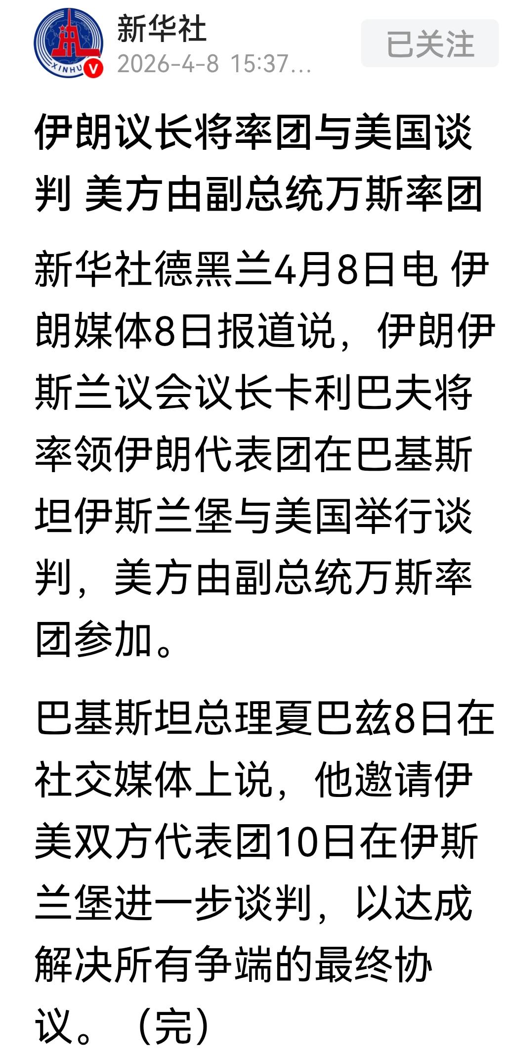 伊朗的谈判代表团决定了,意外的是伊朗代表团的团长不是伊外交部长阿拉格齐,而是伊朗的议长卡利巴夫。 卡利巴夫是伊朗的强硬派代表,伊朗明知让卡利巴夫担任此职,卡利巴夫的人身安全风险极大,但这是伊朗的态度,伊朗在谈判过程中,原则上不能让步与妥协!而且伊朗也非常希望通过谈判得到伊朗想要的东西,卡利巴夫这次担任团才一职,他可能已经将生死置之度外! 说实话!看到伊朗这样出牌,作为旁人,心里也为伊朗捏着一把冷汗。 不过这次谈判、估计美方只会施压、不会再做卑鄙的事情来,但是以色列是个最大的不确定性,如果,双方谈判的内容中没有满足以色列的要求,谁能保证以色列不再动手呢? 但是这次谈判其调解方巴基斯坦比阿曼的实力要强很多,不知巴基斯坦能不能镇住以色列,反正美国对以色列是扯一把、送一把的,美国是管不住以色列的! 祝伊朗好运!祝美伊能达成协议,最终实现中东地区的和平与稳定!最后也祝巴基斯坦好运!能顺利促成协议的达成,而不是让伊朗再次遭到重大损失,让自己也下不了台来!