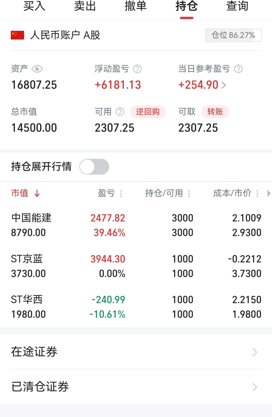 当日浮盈300元。相对大盘涨幅,这是不令人满意的。但选择每一支股票,肯定都有自己的理由,投资都会有风险,回报期望越高,风险越大。持有国企、蓝筹、风评好的,肯定不要说短线就会有超过10%的回报。重仓蓝筹保稳,轻仓ST奇袭,既然要偷渡阴平,就要承担全军覆没(退市)的风险。