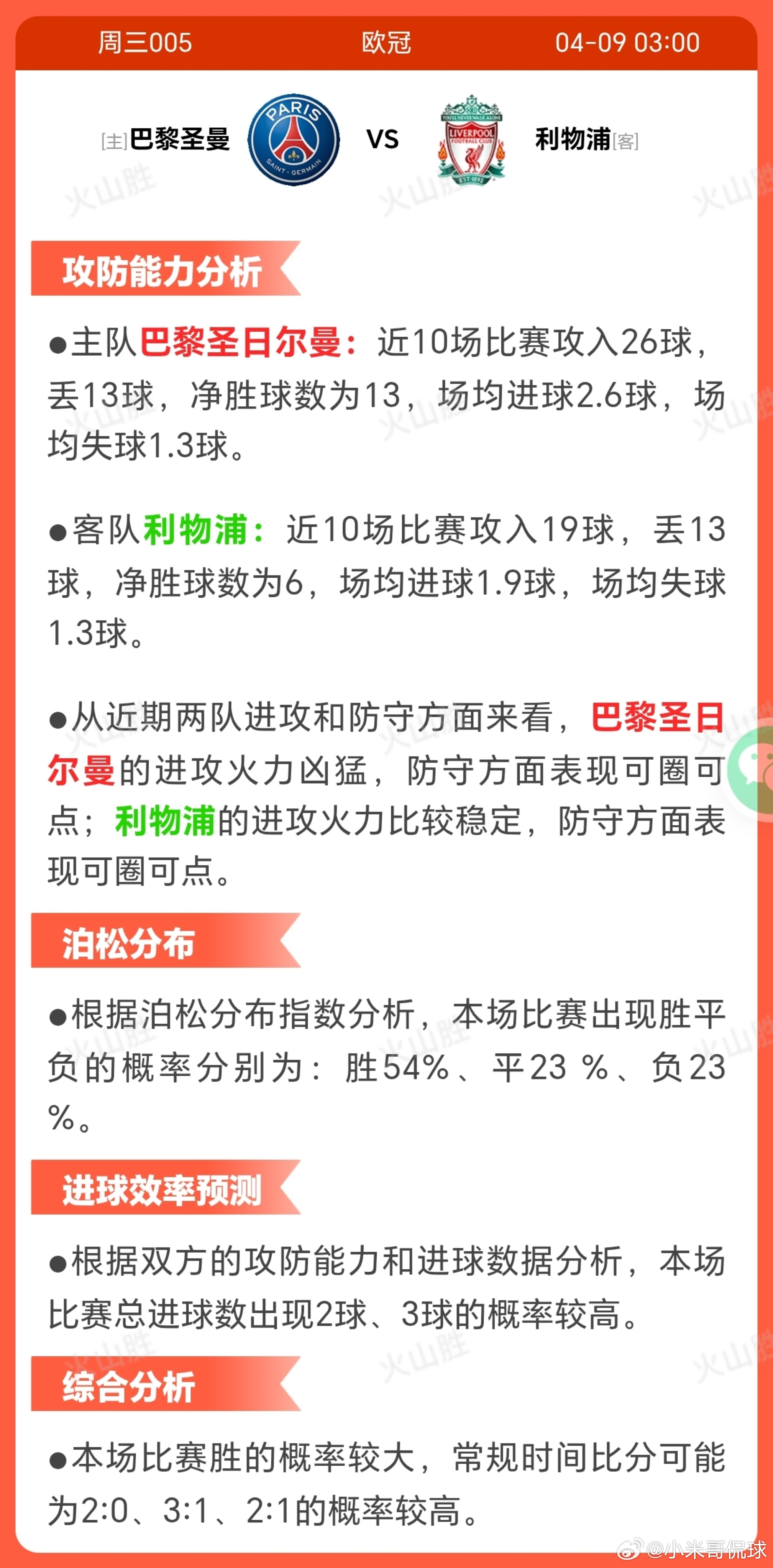 3005-巴黎圣曼VS利物浦巴黎圣日耳曼近期状态稳定,近10场7胜1 平2负,士气较高;战术上偏好控球和短传, 擅长直塞球创造机会、远射和定位球进攻,但争高空球和保持领先是弱点。 对比客队,其进攻创造力较强,但高空球防守劣势可能带来心理压力。 阵容方面,中前卫鲁伊斯及左翼巴尔科拉、恩詹图伤停,影响中场组织和边路进攻, 需克服不确定性。 足球 利物浦近期战绩起伏,近10场5胜1平4 负,波动性可能削弱士气;战术特点包括控球、短传和激烈对抗,优势在争高空球、反击和边路进攻,但定位球防守和保持领先是隐患。 对比主队,其反击能力突出,但防守稳定性面临考验。 伤停严重,守门员阿利松及多名中后场球员缺阵,对防守体系和心理造成沉重压力。每日足球五大联赛