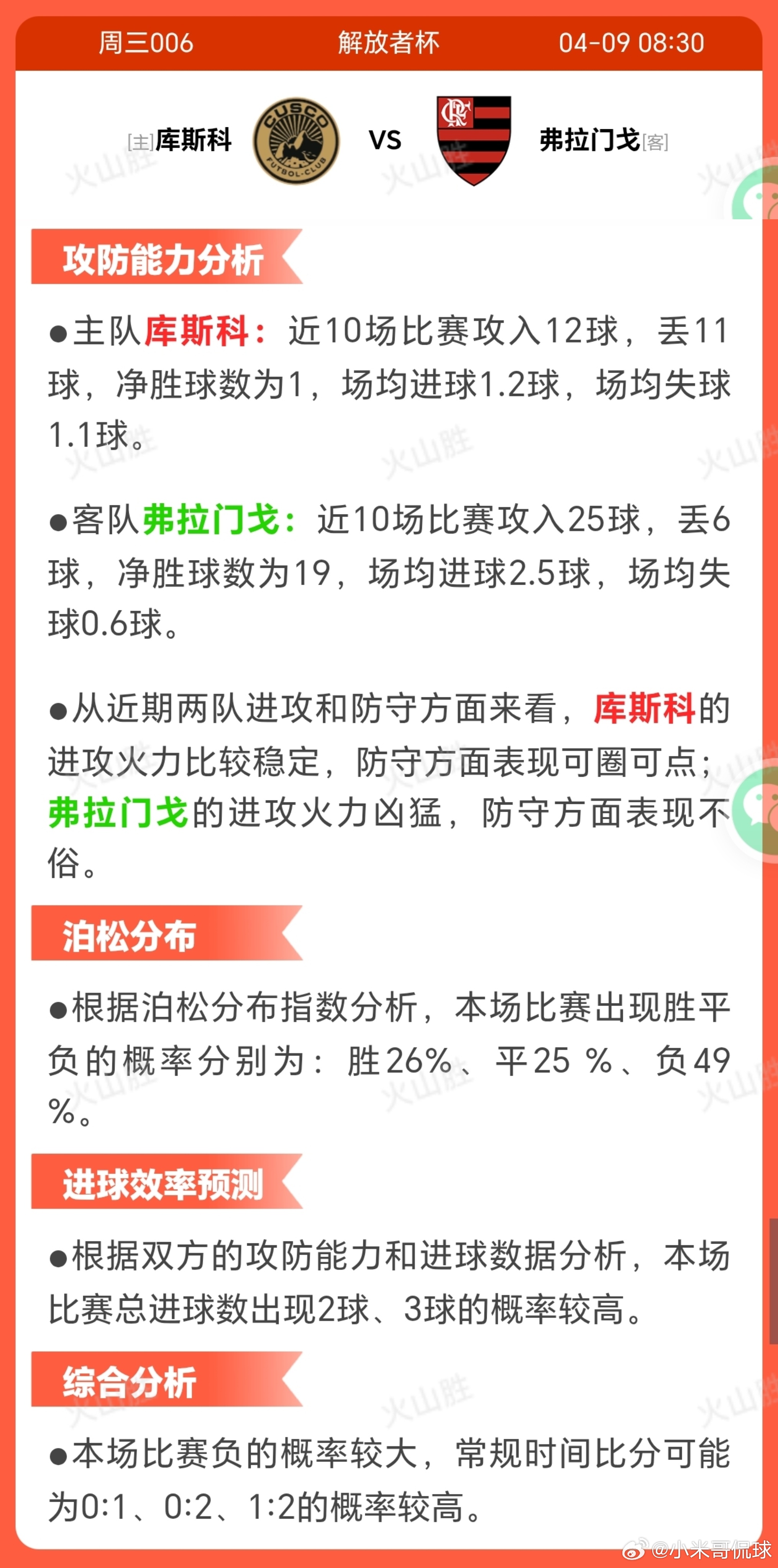 3006-库斯科VS弗拉门戈库斯科近10场4胜1平5负,状态呈现波动。 中场核心米格尔奥因膝关节损伤缺阵,对组织衔接与攻防转换可能造成影响。 面对控球强势的弗拉门戈,需警惕对手中路直塞与右边路下底攻势,其防守边路进攻的弱点或可被利用。 主场作战需激发斗志,但近期战绩起伏可能带来心理压力。 足球 弗拉门戈近10场7胜2平1负,状态稳定且士气高昂。 战术DNA显示其擅长控球围攻、中路进攻与右边路突破,但防守反击与高空球争抢存在隐患。 中场萨乌尔脚后跟受伤缺阵,或影响中前场串联深度。 客战需延续高压打法,但需避免因控球率优势产生轻敌心态,导致防守漏洞被反击利用。每日足球五大联赛