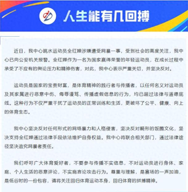 终于有人替全红婵打抱不平了,让人看着很过瘾。 相信很多网友看到,广东省二沙体育训练中心发布的消息,大家都替全红婵开心。 不愧是全红婵的家乡,看到从家乡走出去的优秀运动员,全红婵遭受很多的网暴,表示很心疼,如今选择了报警。 全红婵在东京奥运会一条成名,成名之后,收获了大家的喜欢,只是随着知名度越来越高的同时,也有一些黑粉出现。 先是吐槽全红婵没有文化,话说人家也是不断的成长,不能总是用老眼光看待全红婵。 再说她参加东京奥运会之前,接受媒体采访的言论,并没有什么不妥,都是非常真挚的言论。 如今全红婵长大了,能够感受到她的谈吐有了很大的进步,相信她背后也是在不断的学习。 然而黑粉还是没有放过她,因为体重的原因,这两年全红婵一次又一次遭遇黑粉的声讨。 话说人家小姑娘,经历身体发育,身材胖一点也是很正常的,尤其是她的家人也属于这种体质,发育期的全红婵,看起来比过去胖一点,这都是很正常的。 在大家眼里正常的事情,但是在黑粉眼里不正常,他们用这样的事情一直抨击全红婵,给她带来很大的伤害。 如今看到广东省二沙体育训练中心报警的消息,真的替全红婵开心,以后再也没有人敢欺负她了。