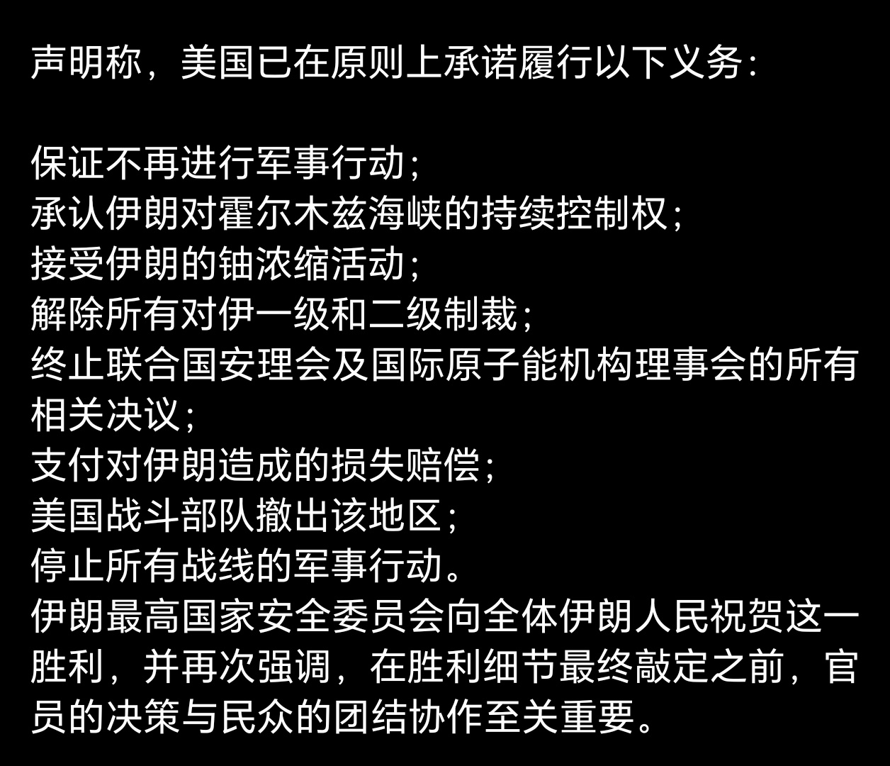 伊朗向全体人民祝贺胜利有点不太敢相信,老美真能答应这些条件??因为不仅仅是停止军事行动,还得赔偿损失,甚至同意铀浓缩以及解除过去的制裁。