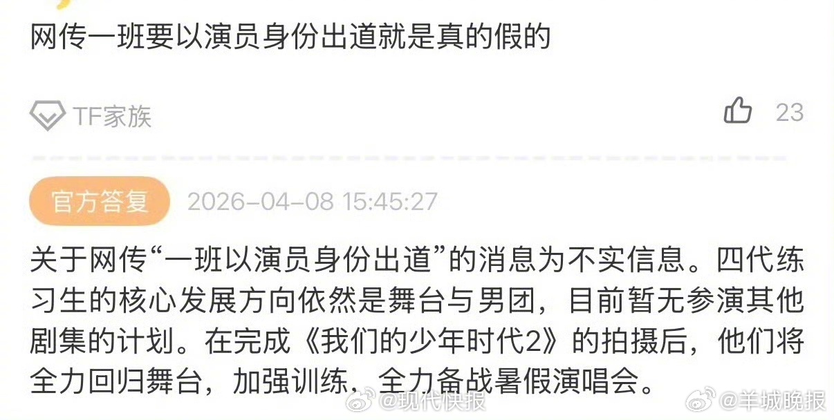 【#TF家族否认四代一班演员出道#】近日,TF家族新生代演员(排名不分先后)主演的电视剧《我们的少年时代2》预约热度暴涨。针对网传“一班以演员身份出道”的消息,TF家族正式回复:消息不实。官方明确:四代练习生核心方向为舞台与男团,目前暂无参演其他剧集计划。在完成《我们的少年时代2》拍摄后,将全力回归舞台、加强训练,全力备战暑假演唱会!(现代快报)