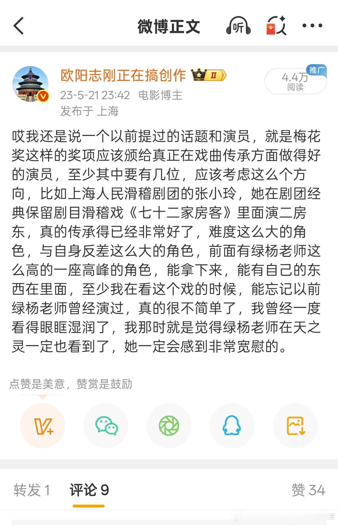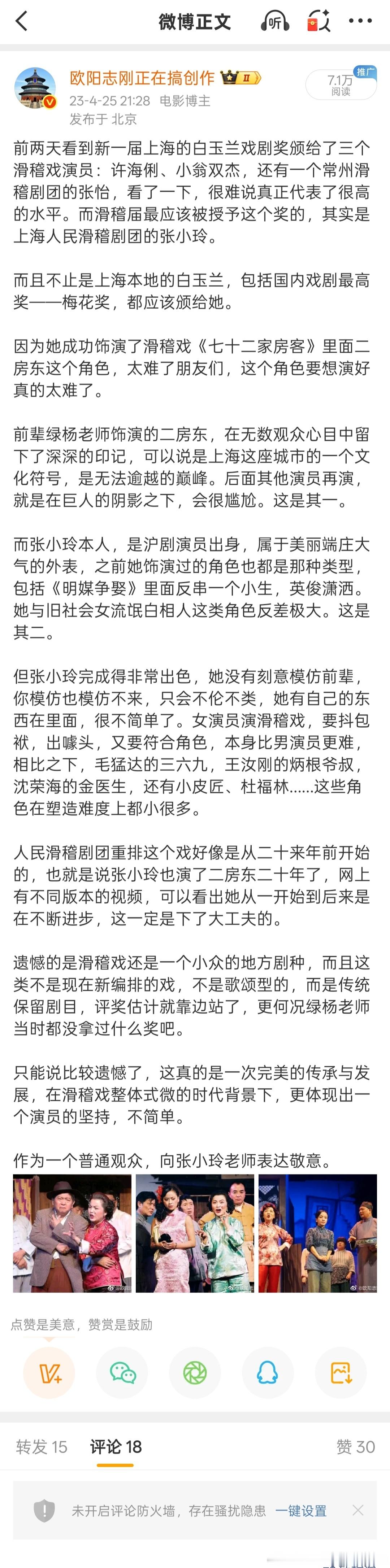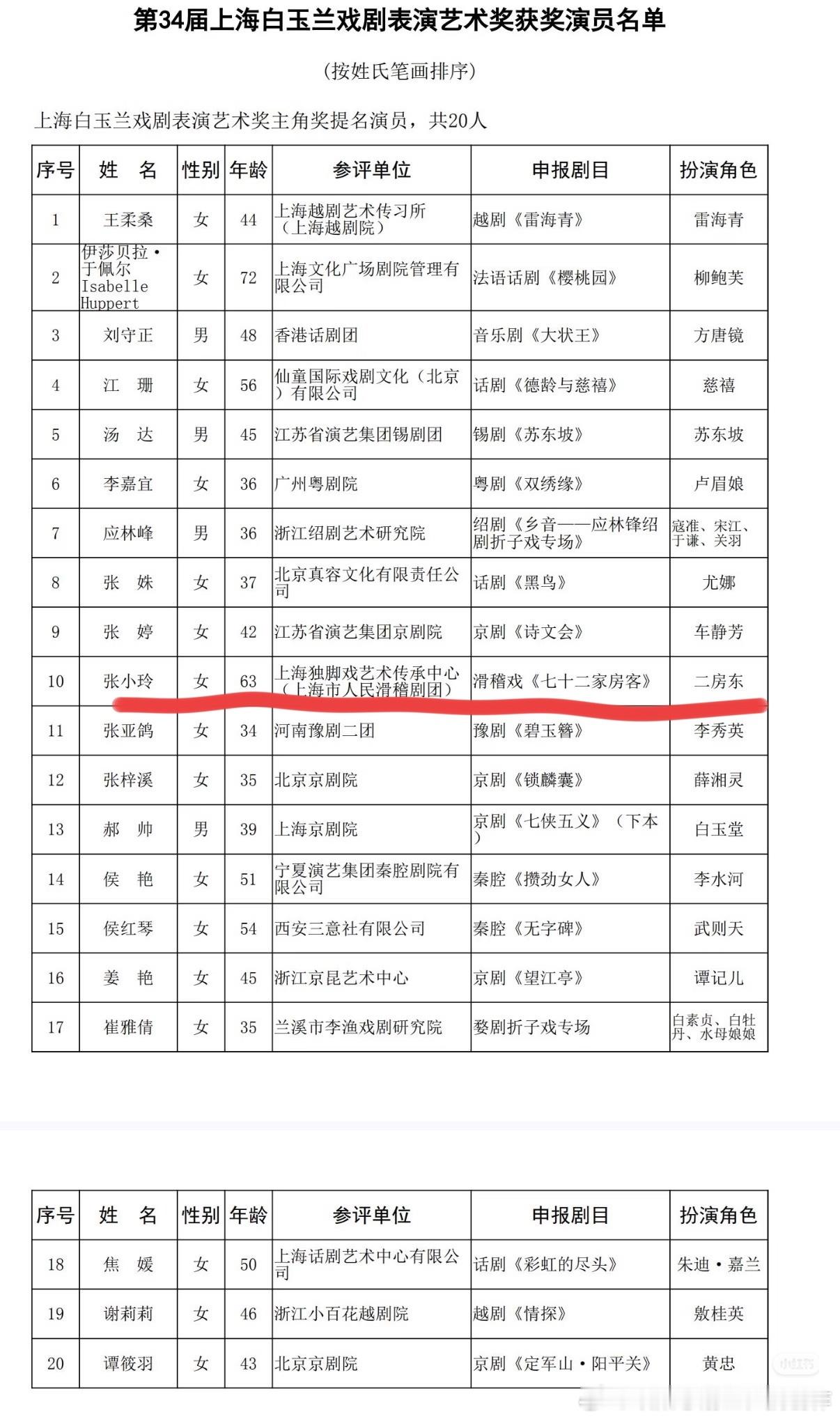 祝贺张小玲老师提名白玉兰,期待最后能拿奖!几年前我就说张小玲的二房东完全应该拿奖,非常成功的角色塑造,非常难。还没在剧场里看过这一版《七十二家房客》,以后有机会去上海看看。