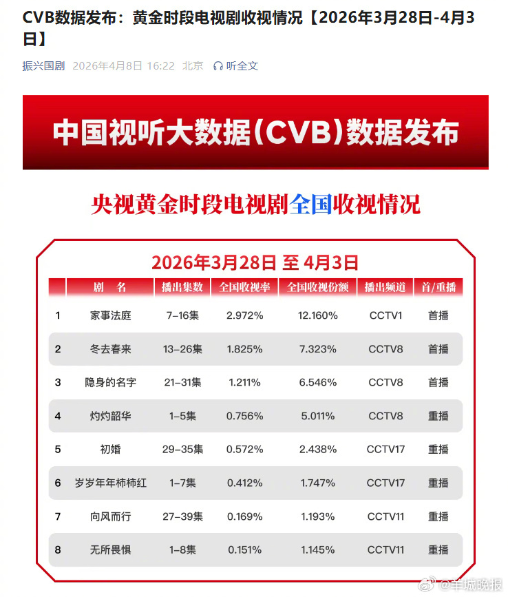 【#龚俊家事法庭收视CVB周榜TOP1#】剧情越来越高能,收视也越来越可观!等主演的《家事法庭》好火~中国视听大数据(CVB)数据发布黄金时段电视剧收视情况(3月28日-4月3日)。其中,央视黄金时段电视剧全国收视情况中,《家事法庭》全国收视率2.972%位列第一。来说说,你最喜欢剧中哪个片段?评论区聊聊↓↓(中新文娱)更多消息:#金子涵说的是谁##江语晨 抚养权官司##金子涵 再逼我就把所有的都说出来##阚清子团未脱稿被赵兆狠批##十日终焉官微 用户1231##刘宇宁直播##宇文玥捞上来了##家事法庭收视CVB周榜TOP1#(编辑:惠天骄;审签:岑杰昌)