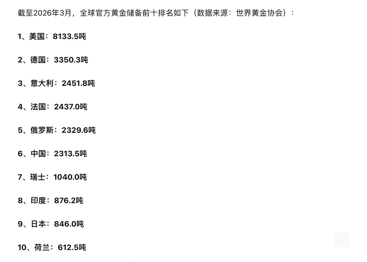 全球央行黄金储备前十来了!美国8133.5吨遥遥领先,德国、意大利、法国紧随其后。中国2313.5吨排第六,还在持续增持,俄罗斯以2329.6吨排第五。这些黄金储备,都是各国的金融压舱石。