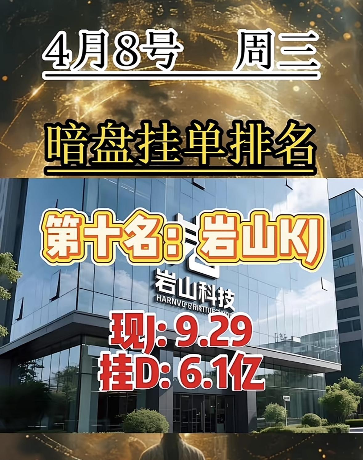 4月9日周四暗盘隔夜挂单排行榜揭晓 岩山科技暗盘挂单排名第十,现价9.29,挂单价6.1亿。这数据看着就刺激,不知道后续会咋走。 从之前的走势分析,它今日表现稳健,开盘9.10元,最高9.34元,收盘9.21元,小幅涨0.33%。不过9.2元压力位是关键,前期涨幅还在消化,今日没突破说明抛压强。股价虽站上短期均线成多头排列,但前期暴跌的套牢盘也得时间消化。若明日放量突破9.3元,上涨空间打开;跌破9.0元,可能重回下行通道。这岩山科技就像个调皮的孩子,走势让人又期待又紧张!