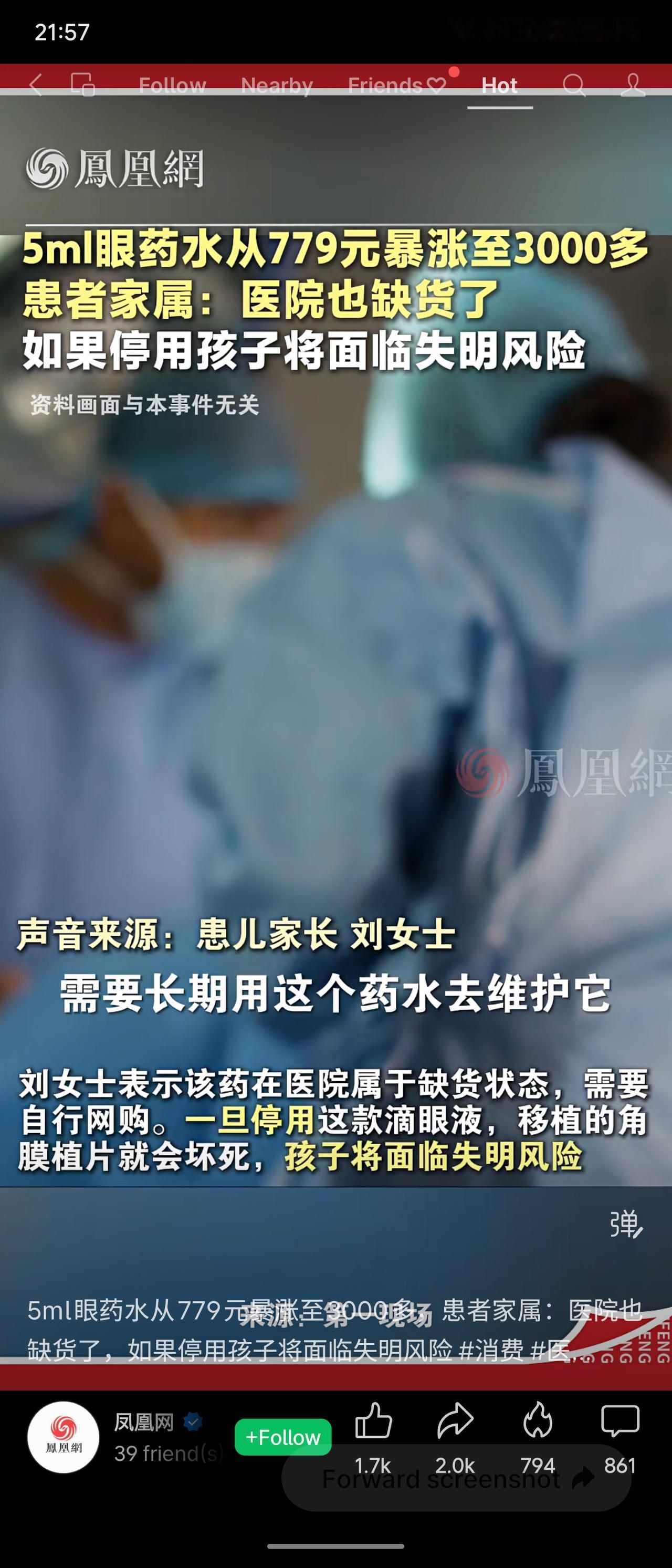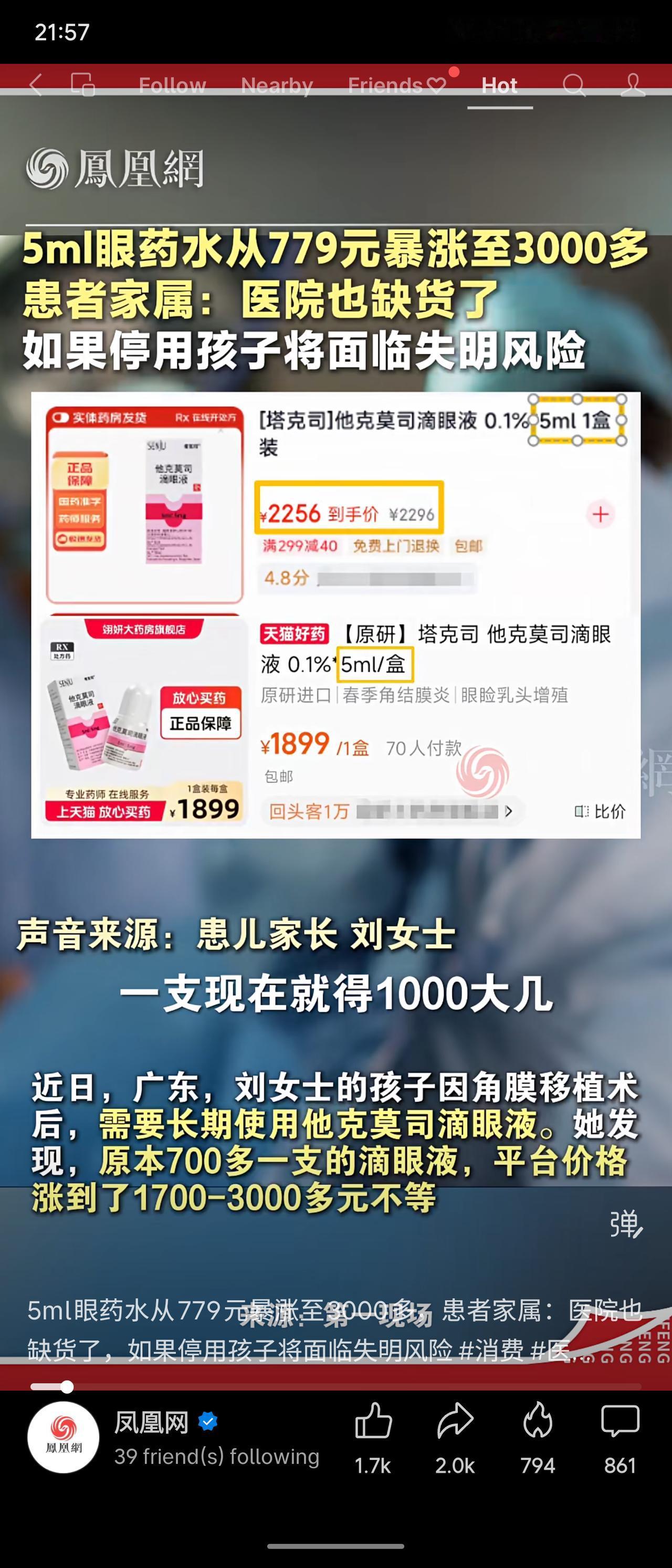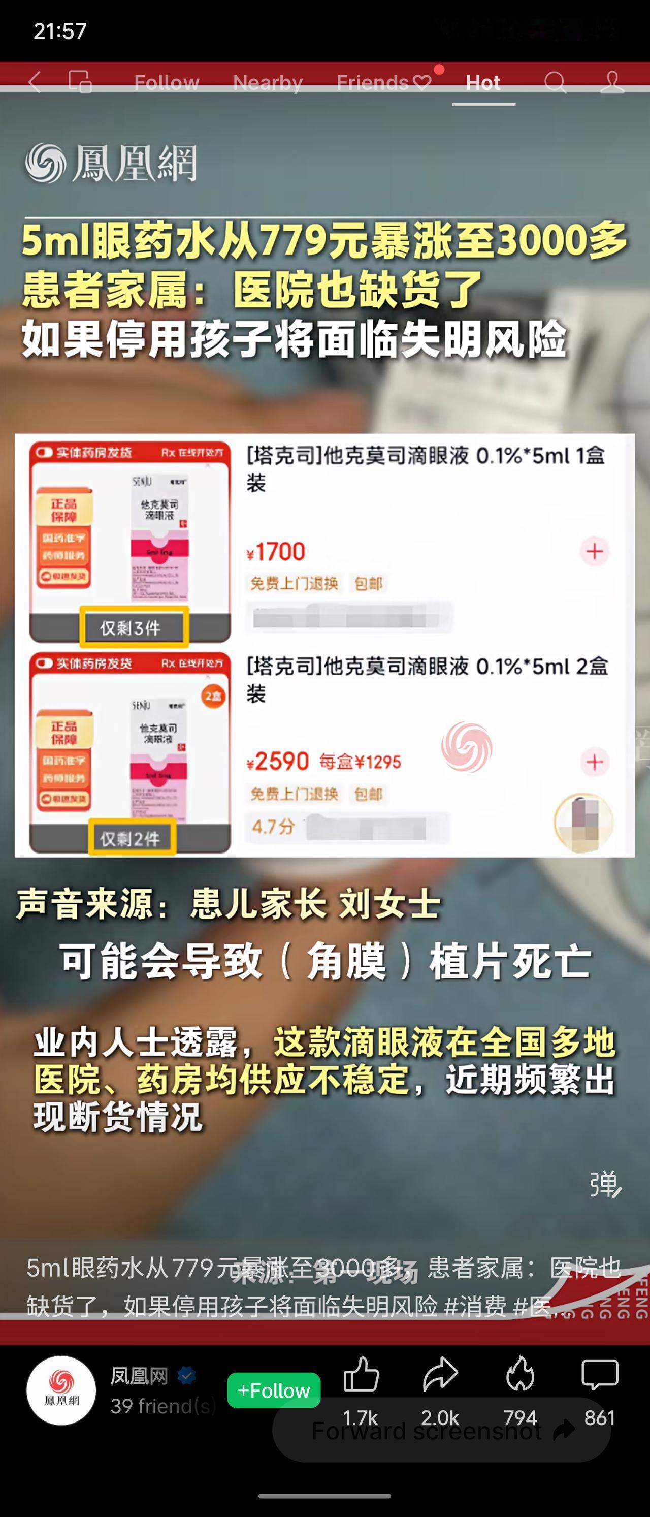 一款5ml他克莫司滴眼液价格从779元暴涨至3000多元,医院缺货,患儿家属只能网购。若停用,移植角膜植片可能坏死,孩子面临失明风险。业内人士称该药多地供应不稳定,频繁断货。 罕见病及术后必需药品价格暴涨、供应中断,直接威胁患者生命健康,暴露了短缺药品预警与保障机制的短板。相关部门应尽快介入调查,稳定供应、规范价格,避免患者因“药荒”“天价”而陷入绝境。