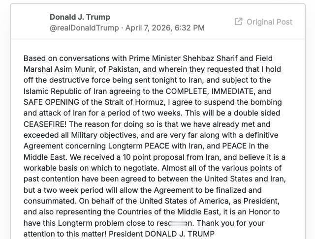 特朗普在北京时间6时32分发帖称:“根据与巴基斯坦总理谢赫巴兹·谢里夫(Shehbaz Sharif)和田军元帅阿西姆·穆尼尔(Asim Munir)的对话,他们请求我暂缓今晚对伊朗发动的毁灭性打击,如果伊朗伊斯兰共和国同意完全、立即和安全地开放霍尔木兹海峡,我同意暂停对伊朗的轰炸和攻击,为期两周。这将是双方的停火!” 北京时间4月7日深夜,美国总统特朗普在自己的社交平台上发了这样一条消息。帖子里直接提到,他和巴基斯坦总理谢赫巴兹·谢里夫还有陆军元帅阿西姆·穆尼尔通过电话聊过。两位巴基斯坦领导人提出请求,希望美方把当晚计划对伊朗的打击行动往后推一推。特朗普说,如果伊朗那边答应马上、彻底而且安全地把霍尔木兹海峡打开,让船只正常通过,他就把对伊朗的轰炸和攻击停下来,时间定为两周。这段时间算作双方停火。 这件事发生在美东时间4月7日下午,离特朗普自己设的最后期限只剩不到两个小时。那之前,特朗普多次在平台上发话,说如果伊朗不恢复海峡航运,美国和以色列的行动就会扩大,包括针对伊朗的基础设施。巴基斯坦在这当中扮演了调解角色。谢里夫早些时候也在自己的X账号上发帖,请求特朗普把期限延长两周,同时呼吁伊朗把开放海峡当成善意举动,持续两周,好让外交有空间推进。 特朗普在帖子里解释了原因。他说美方已经完成并且超过了设定的军事目标,在和伊朗谈长期和平协议以及中东地区稳定方面也取得了不少进展。伊朗那边提交了一份十点建议,美国觉得这可以作为谈判的基础。过去很多争执点,美伊双方已经基本达成一致,两周时间刚好够把协议细节最后敲定下来。帖子的结尾,特朗普表示自己作为美国总统,同时代表中东相关国家,觉得能让这个拖了很久的问题接近解决,心里挺欣慰的,还谢谢大家关注。 霍尔木兹海峡对全球能源供应非常关键,每天有大量石油从那里运出。之前因为冲突,海峡通行受影响,油价一度波动挺大。特朗普这次决定暂停行动,直接和海峡开放挂钩,等于给双方一个缓冲期。巴基斯坦的介入让事情有了转机,他们和美伊都保持联系,帮忙传话协调。 伊朗方面后来通过最高国家安全委员会表示,接受这个两周停火安排。伊朗也提到,会协调武装力量确保海峡船只安全通过。巴基斯坦总理谢里夫随后在社交平台上欢迎这个消息,还邀请美国和伊朗的代表团到伊斯兰堡继续谈,时间定在4月10日星期五,目的是把所有争端都解决掉,达成最终协议。他在帖子里说,各方都展现出智慧和理解,希望伊斯兰堡会谈能带来可持续的和平。 整个过程显示,巴基斯坦在这次区域紧张局势中起了不小的作用。作为调解方,他们既和美国保持沟通,也和伊朗有渠道。谢里夫和穆尼尔在通话中强调外交的重要性,让特朗普在最后关头选择了暂停而不是立即扩大行动。特朗普的帖文发出后,市场反应比较明显,油价有所回落,全球航运公司开始关注海峡恢复通行的消息。 从实际看,这两周停火期给了各方喘息空间。美方可以继续评估军事成果,伊朗那边需要展示开放海峡的诚意,巴基斯坦则负责推动后续谈判。协议如果能谈成,对中东地区稳定会有帮助,毕竟霍尔木兹海峡堵塞直接影响全球能源价格和供应链。特朗普在帖子里特别提到,已经和伊朗在很多点上接近一致,只差最后落实,这也说明前期的接触不是白费。 谈判将按计划在伊斯兰堡推进,焦点就是把协议最终定下来。美方暂停军事行动后,区域紧张程度有所降低,各方通过现有渠道保持联系。