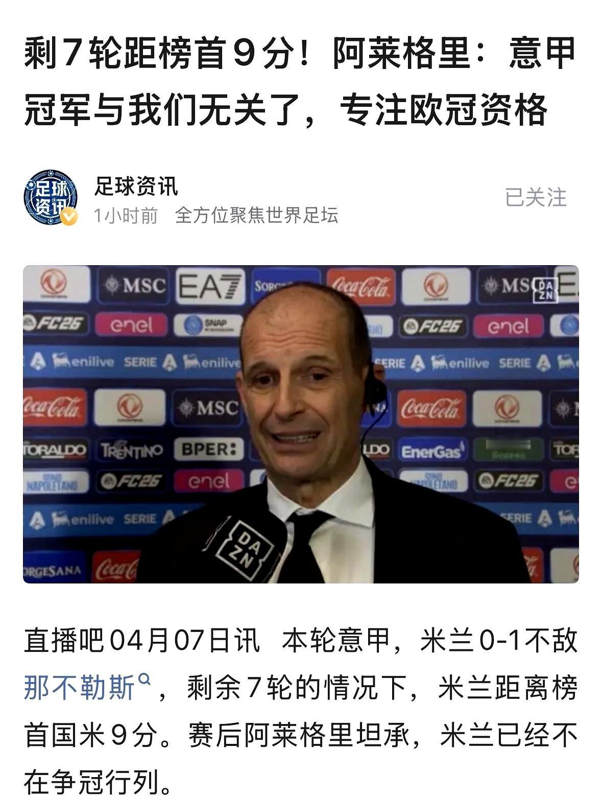 两大世界名帅,同一天认输! 穆里尼奥带的本菲卡,1比1踢平卡萨匹亚后彻底炸了!直接跟记者说,丢球不心痛,心痛的是争冠希望彻底没了,连亚军都悬了。 另一边,阿莱格里也一样。AC米兰0比1输给那不勒斯,落后国米9分。他赛后直接摊牌:争冠跟我们没关系了,老老实实保欧冠资格吧。 有意思的是,皇马那边也落后巴萨7分,可年轻教练阿韦洛亚嘴还挺硬,愣是没说一个“不”字。 这事儿,你怎么看?