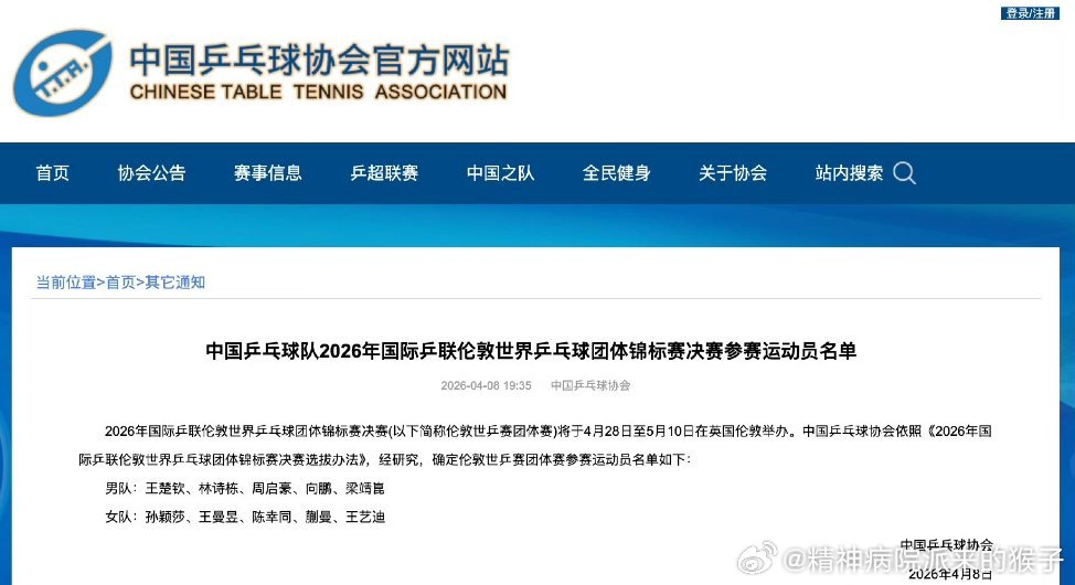 中国乒协公布伦敦世乒赛团体赛参赛运动员名单🏓男团:王楚钦、林诗栋、周启豪、向鹏、梁靖崑女团:孙颖莎、王曼昱、陈幸同、蒯曼、王艺迪