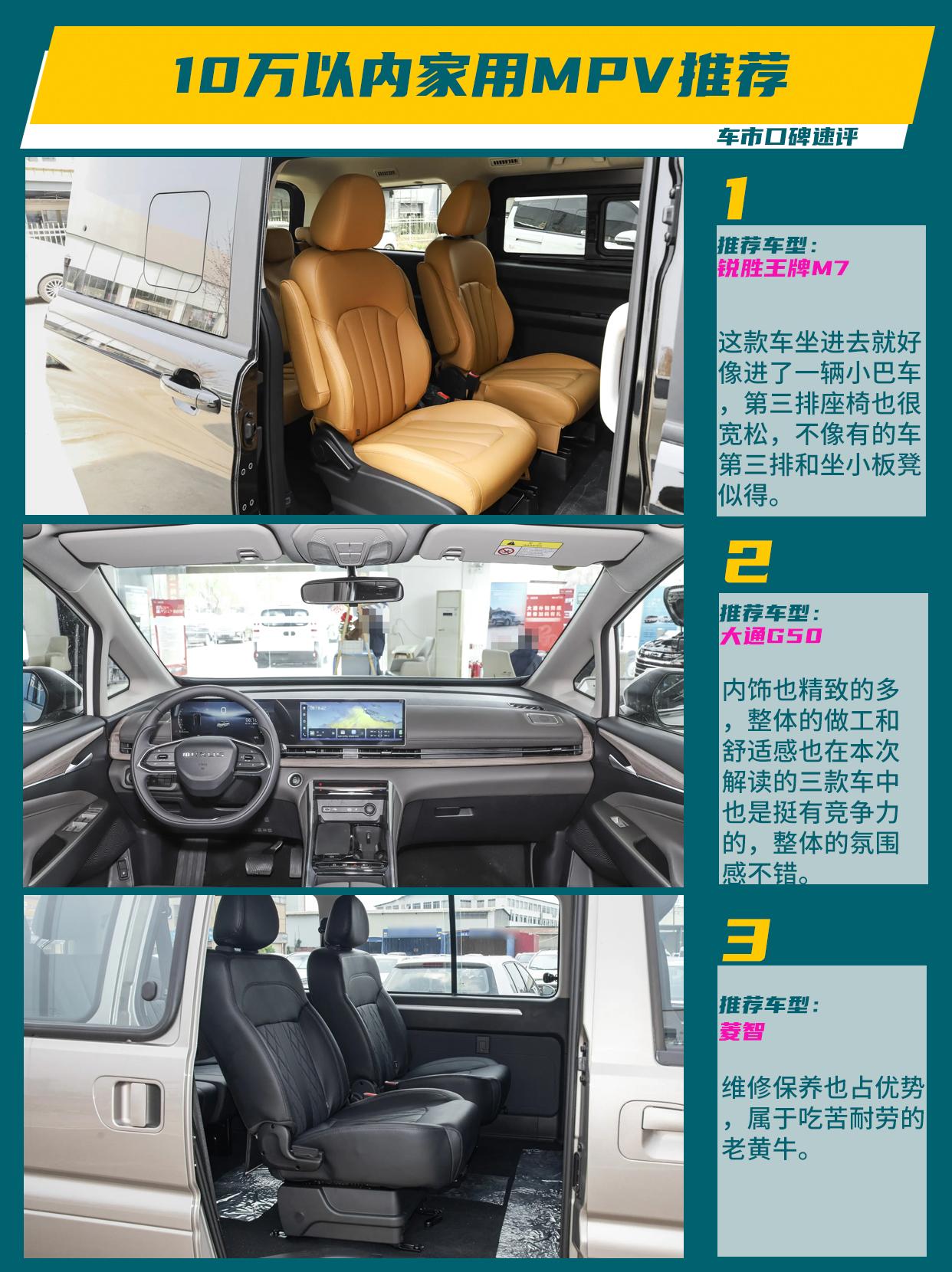你别不信,10万以内买家用车,除了轿车还能看看MPV车型,比如我们今天要提到的锐胜王牌M7、大通G50、菱智,都是一些大空间的家用MPV车型,接下来我们就一起看看,哪一款更适合你。 1、锐胜王牌M7,厂商指导价5.98-15.38万 这可是一款正儿八经的中大型MPV,也是一款以空间著称的车型。最多可以提供9个座位,如果家里人少的话,完全可以选择7座的版本,更加实用。这款车坐进去就好像进了一辆小巴车,第三排座椅也很宽松,不像有的车第三排和坐小板凳似得。 槽点就是,这么大的车动力稍微肉一点,建议选择2.0L的版本,动力会好一些。 2、大通G50,厂商指导价8.68-12.98万 这款车也是一款实用的家用MPV,座椅也很灵活,建议选择2+2+3的布局,这样对于后排的乘客来说也是很友好的,上下车也更加方便。内饰也精致的多,整体的做工和舒适感也在本次解读的三款车中也是挺有竞争力的,整体的氛围感不错。 槽点就是低配版的配置有点寒酸,想要更好的配置需要选MAX版, 3、菱智,厂商指导价5.99-9.99万 菱智是一个老家伙了,这款车也是得到了终端的认可,保有量也挺大,维修保养也占优势,属于吃苦耐劳的老黄牛。 要说槽点就是座椅舒适感一般,适合创业用。 以上三款车都是性价比挺高的MPV车型,如果想要更大空间,座椅更灵活,可以考虑锐胜王牌M7;如果家用的话,强调舒适感,选择大通G50;图省心耐造的话可以考虑菱智。【来自懂车帝车友圈】