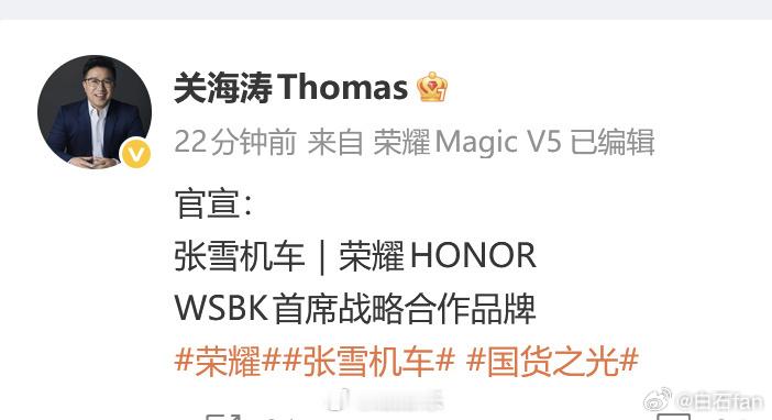 荣耀张雪机车战略合作张雪爆火后,很多品牌都想合作没想到第一个是荣耀关总回归荣耀后的大手笔!有点意思!张雪出踏板的话,我会考虑的