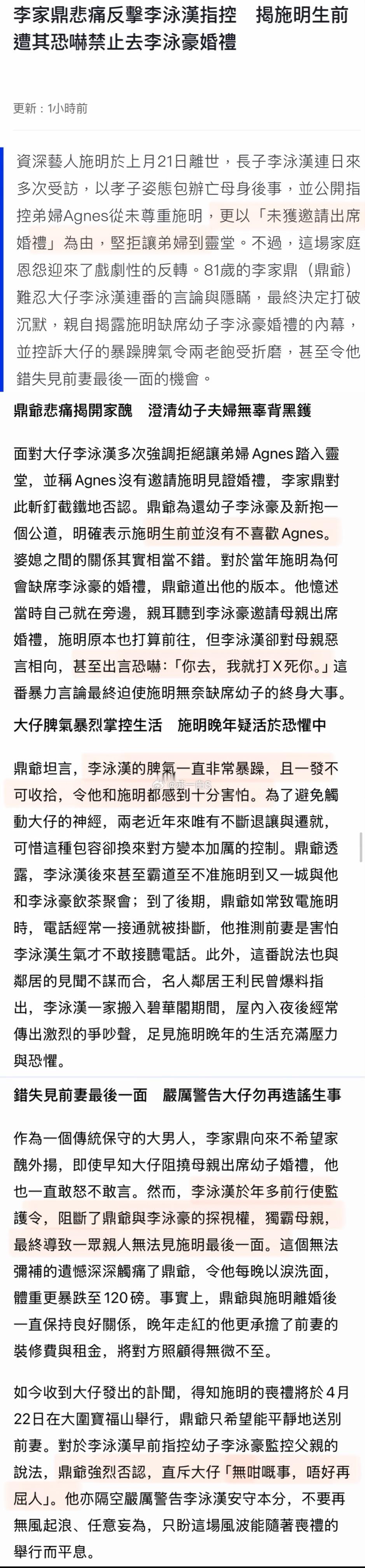 李家鼎希望,能平静送别前妻,呼吁大儿子李泳汉不要再闹事了。