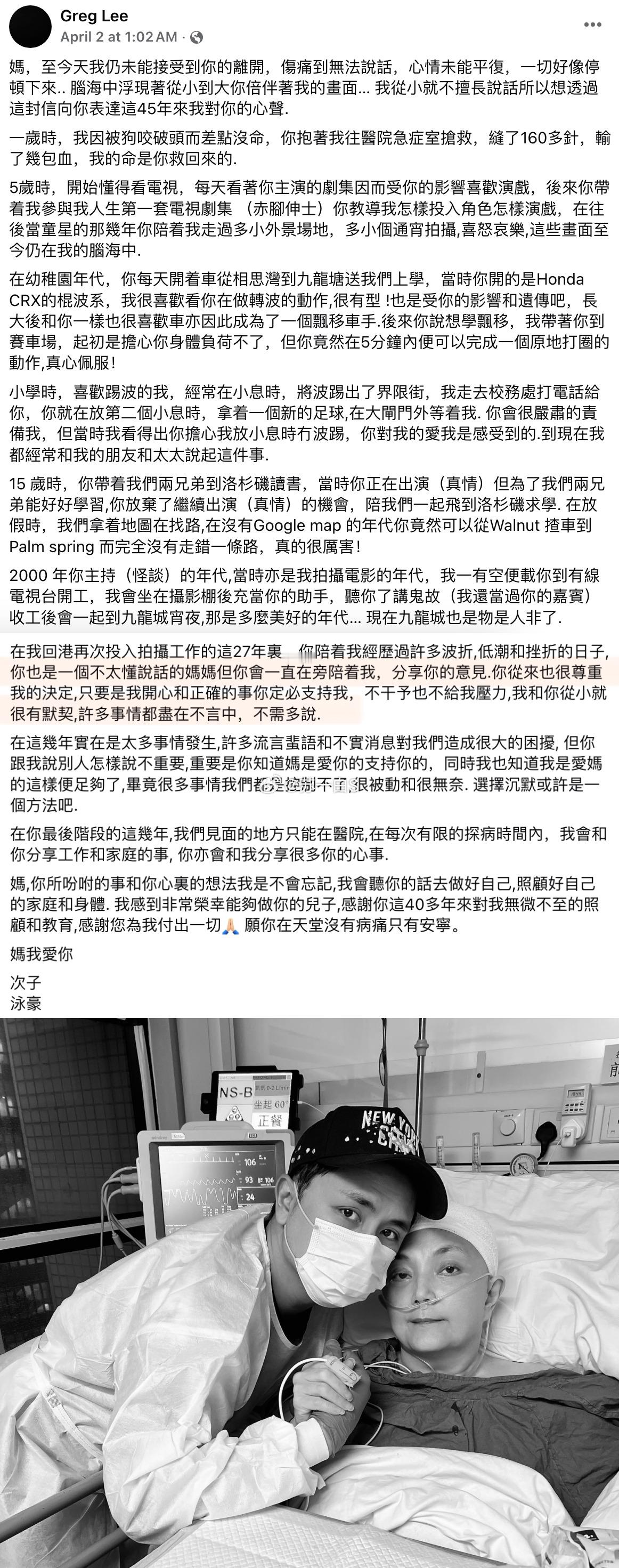 而弟弟李泳豪只在其社交平台发了一篇长文(图七),不舍母亲,字里行间总感觉有话没说完;