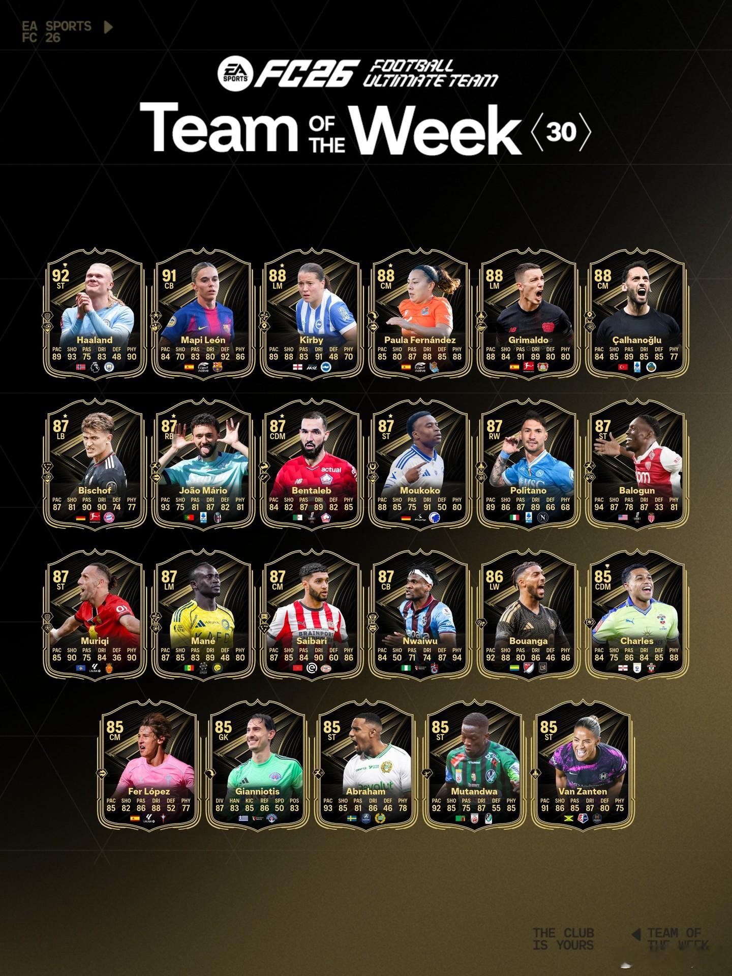 FC 26 Ultimate Team周最佳阵容TOTW第三十周公布。哈兰德领衔。