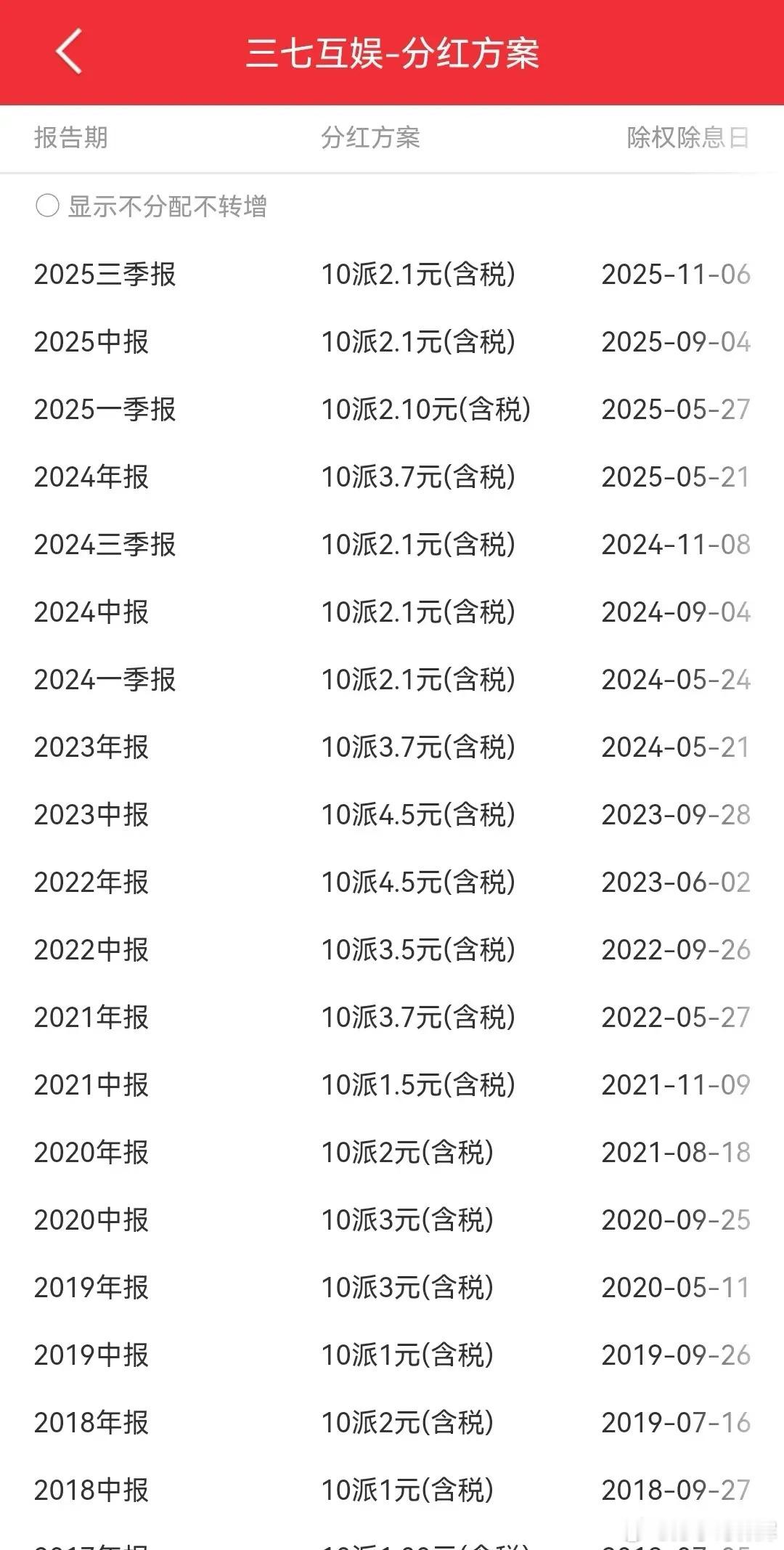 二、三七互娱。去年股民们收到了四次分红,分别是:10派3.7元,10派2.1元,10派2.1元,10派2.1元,合计10派10元,股息率4.59%,行业排名第二。