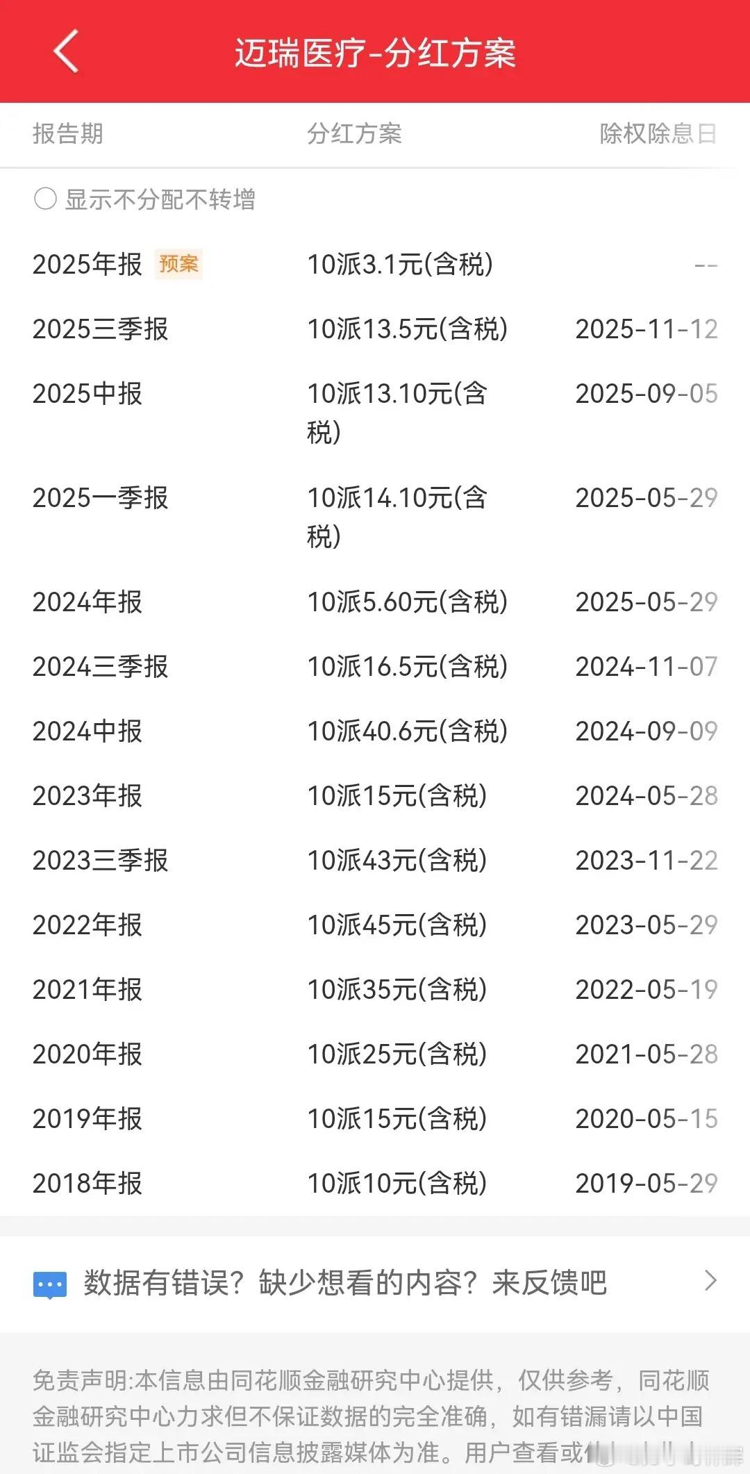 一、迈瑞医疗。去年股民们收到了四次分红,分别是:10派5.60元,10派14.10元,10派13.10元,10派13.5元,合计10派46.3元,股息率2.78%,行业排名第三。