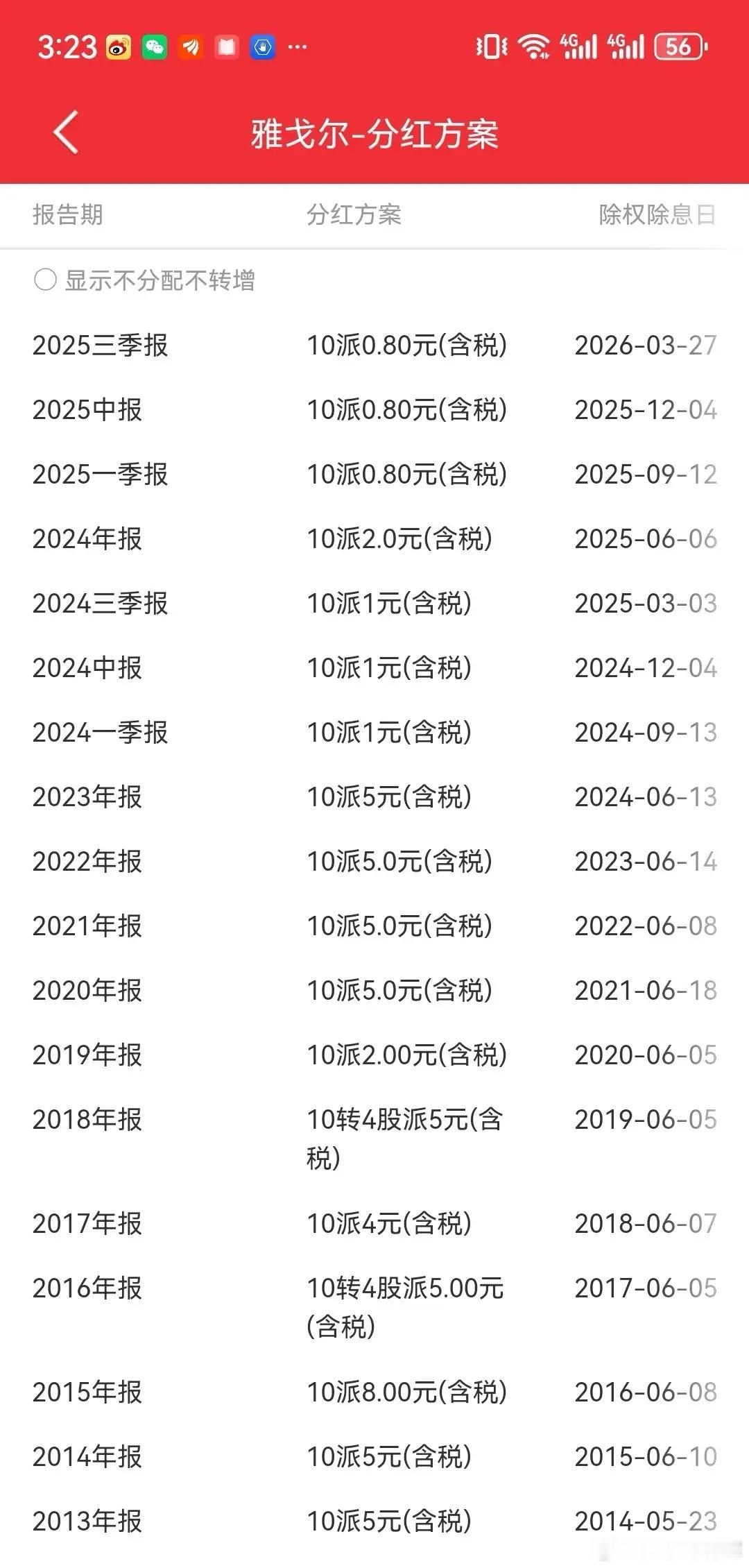 三、雅戈尔。去年股民们收到了四次分红,分别是:10派1元,10派2元,10派0.8元,10派0.8元,合计10派4.6元,股息率6.72%,行业排名第二。