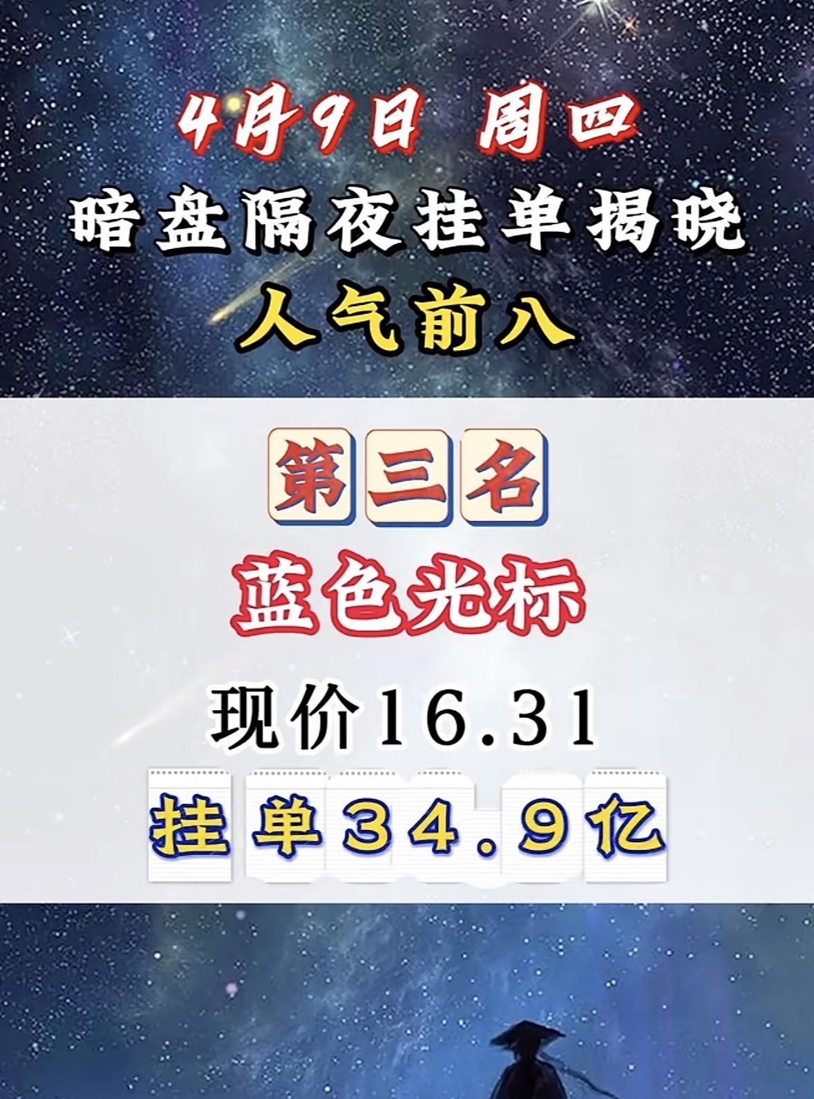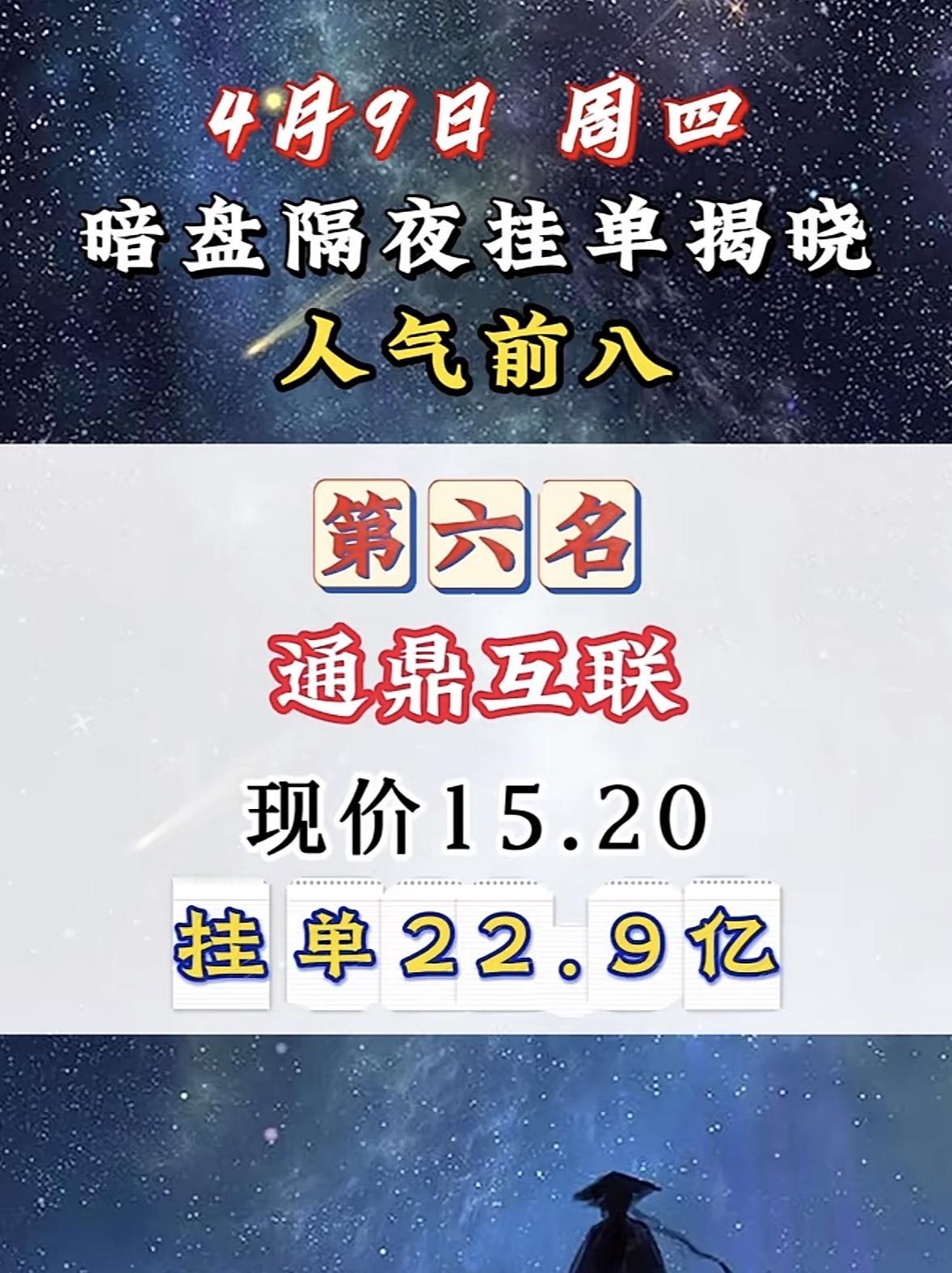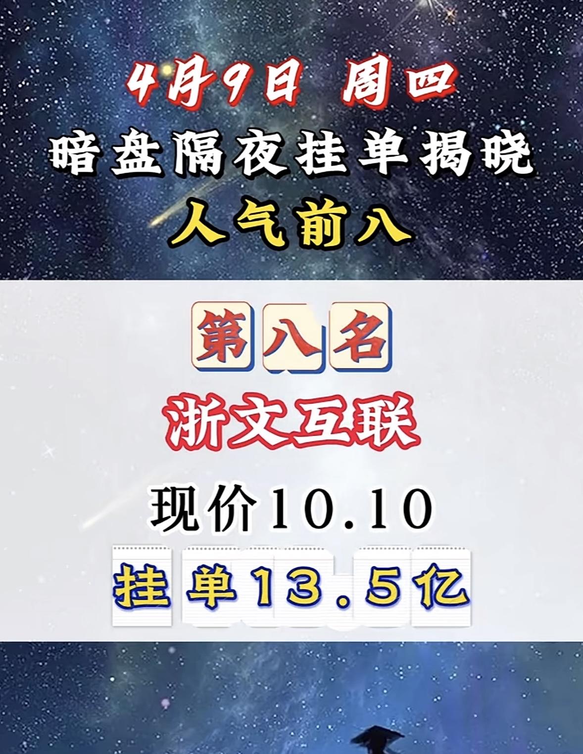4月9日周四暗盘隔夜挂单排行榜出炉 4月9日暗盘要揭晓啦,浙文互联这情况有点意思。现在它的现价是10.10,挂单居然达到了13.5亿,这数字可够惊人的。这么大的挂单量,感觉市场对它的关注度超高啊。说不定暗盘揭晓后会有大动静,要是涨起来,那可就赚翻了;但要是跌了,那也挺让人肉疼的。我觉得这就像一场赌博,大家都在赌它之后的走势。不过股市这东西,谁也说不准,只能静静等着暗盘揭晓那一刻,看看是惊喜还是惊吓。