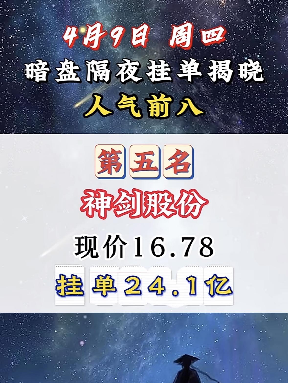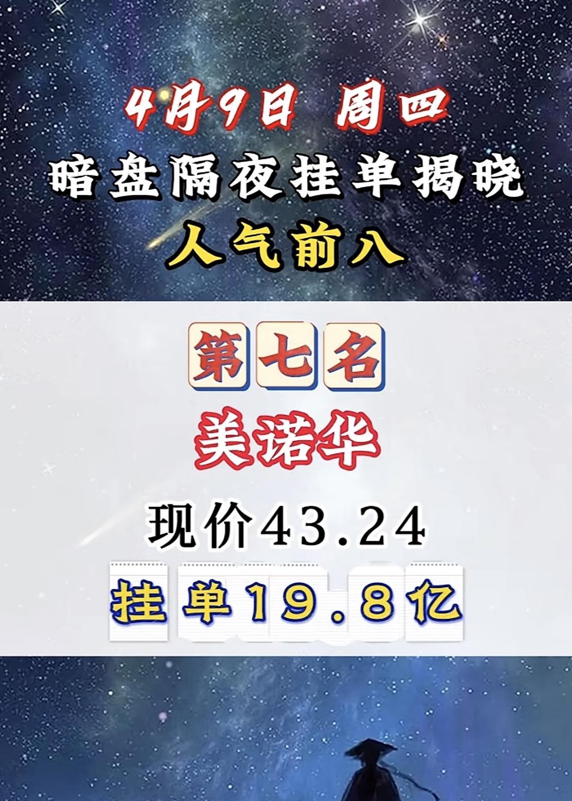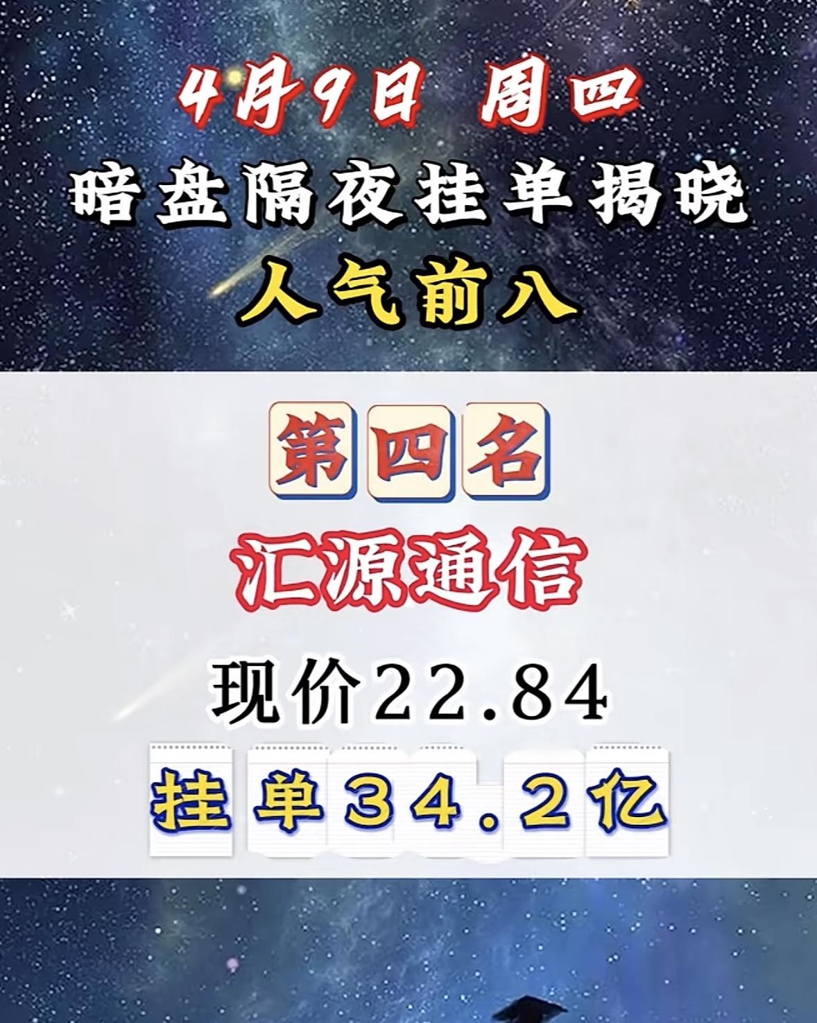 4月9日周四暗盘隔夜挂单排行榜出炉 4月9日暗盘要揭晓啦,浙文互联这情况有点意思。现在它的现价是10.10,挂单居然达到了13.5亿,这数字可够惊人的。这么大的挂单量,感觉市场对它的关注度超高啊。说不定暗盘揭晓后会有大动静,要是涨起来,那可就赚翻了;但要是跌了,那也挺让人肉疼的。我觉得这就像一场赌博,大家都在赌它之后的走势。不过股市这东西,谁也说不准,只能静静等着暗盘揭晓那一刻,看看是惊喜还是惊吓。