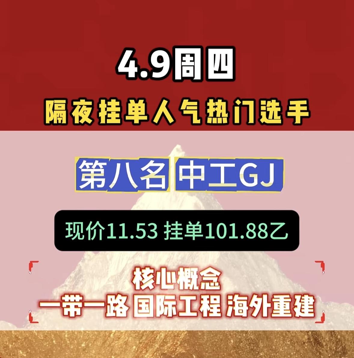 4月9日周四暗盘隔夜挂单排行榜揭晓 4月9日暗盘我打算隔夜挂中工国际股票,现在股价11.53,我挂单101.88。这差距有点大,但炒股不就是玩心跳嘛。中工国际在4月8日涨势不错,涨了10.02%,总市值142.67亿。有人觉得它在中东有不少项目,像伊朗重建就有机会,毕竟它承建过伊朗大不里士省2号输水管线项目等。不过也有人担忧,万一伊朗重建交给别人,中工国际可能就被打回原形。我这挂单就当赌一把,说不定真能大赚一笔,要是不行就当交学费咯。