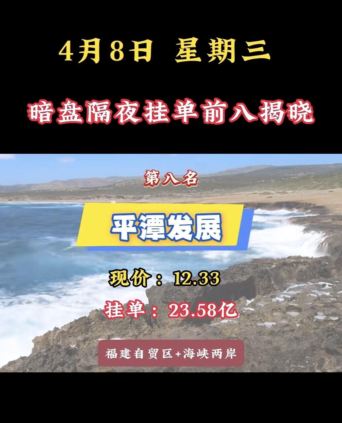 4月9日周四暗盘隔夜挂单排行榜揭晓 4月8日平潭发展暗盘揭晓,这票最近可是市场焦点。现价12.33元,挂单达23.58亿,还是福建自贸区+海峡两岸概念。 从3月底它就开启猛拉模式,不少人后悔没上车,4月1日又来根大阴线,套住一批人。4月2日成交额42亿,换手率近18%。这公司主业是种树和卖木板,手握近90万亩林地,是A股里实实在在的硬资产。 它短期受益政策利好等因素,股价涨幅稳健,市场做多情绪回暖;中长期依托政策红利和业务多元化,有望业绩增长。不过投资有风险,适合能承受行业波动、风险承受能力中等的人。