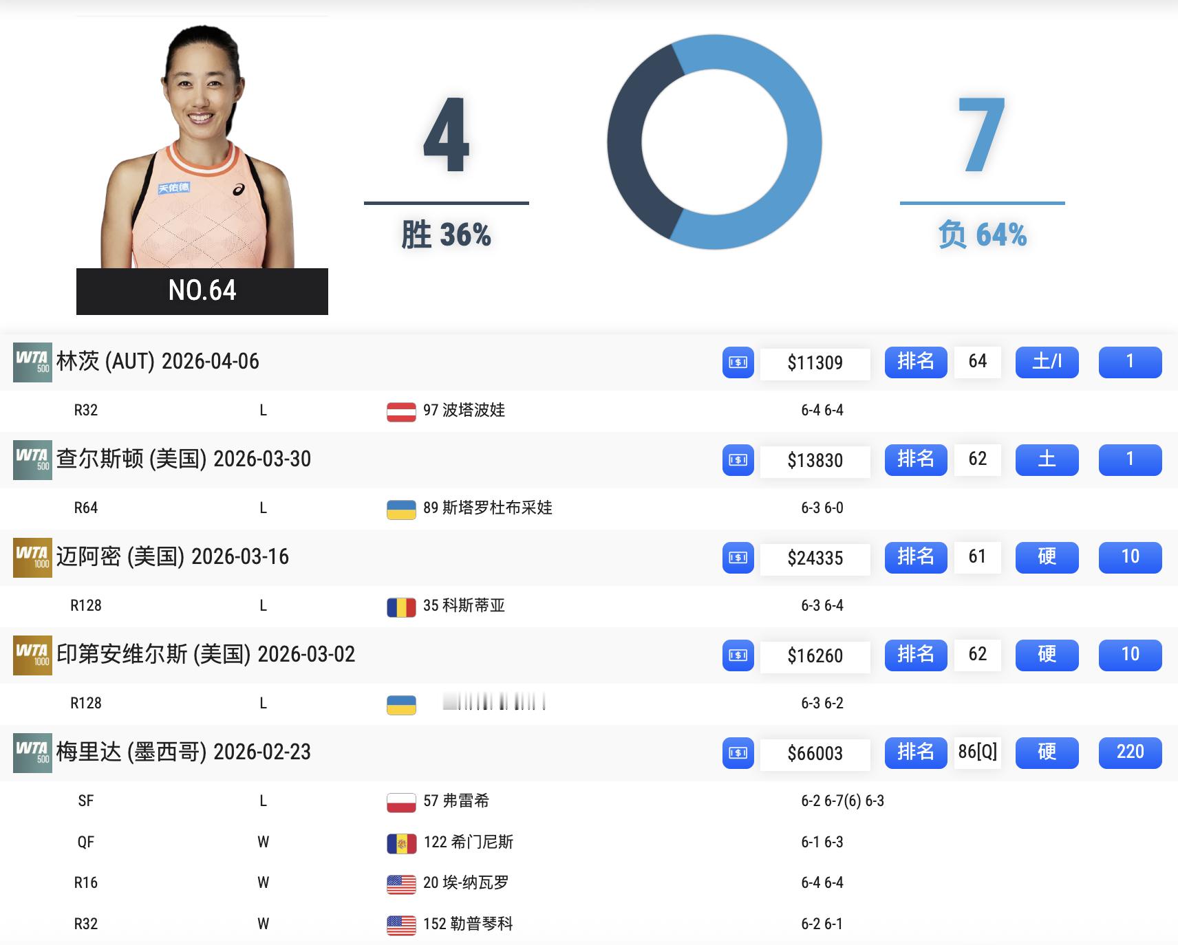 奶茶娃和压力娃今年的战绩……🇷🇺萨姆索诺娃:4胜9负,遭遇7次一轮游,目前6