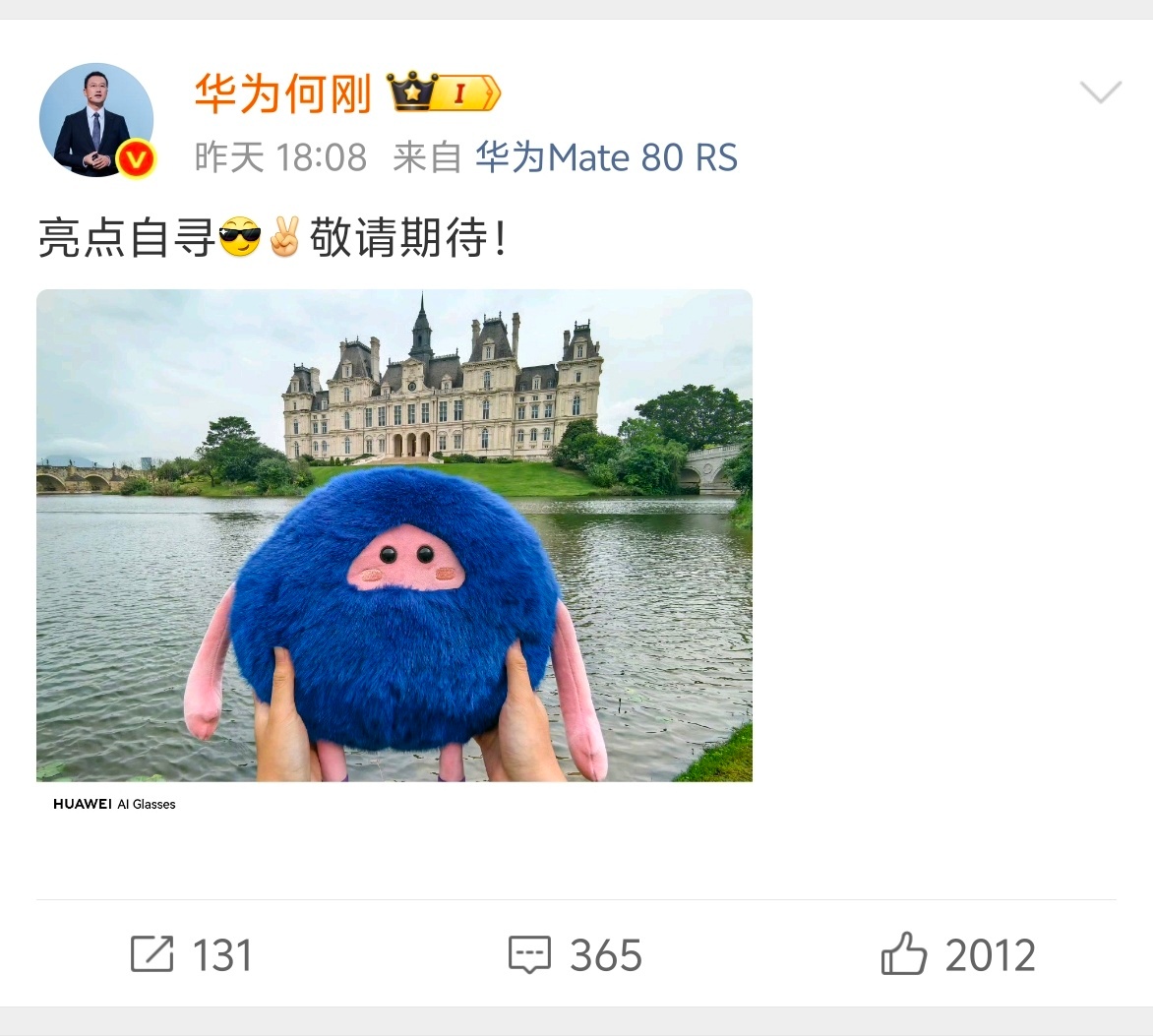 华为AI眼镜即将发布华为的AI眼镜终于要来了!刚刷到何刚总发的图,水印直接写着“HUAWEI AI Glasses”,基本没有悬念了!