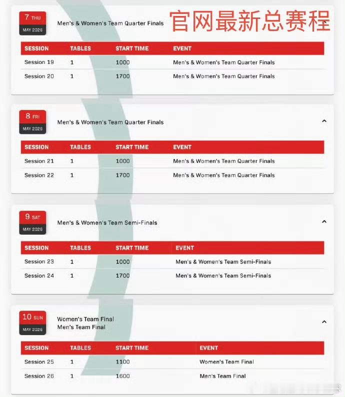 🏓男、女团1/4决赛:5月7日17:00、0:005月8日17:00、0:00